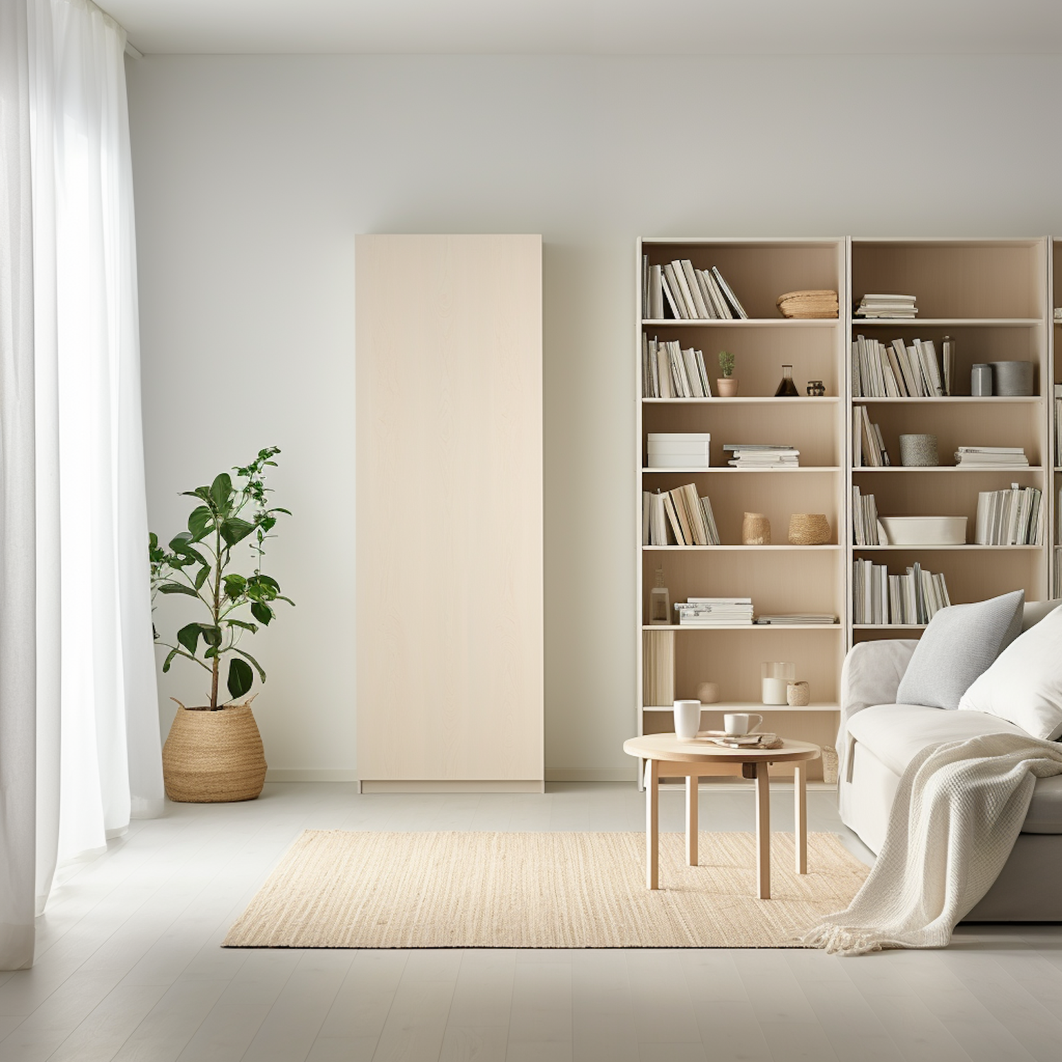 Minimalist living room with beige tones, cozy sofa, wooden coffee table, bookshelf, and potted plant. Soft natural light fills the space.