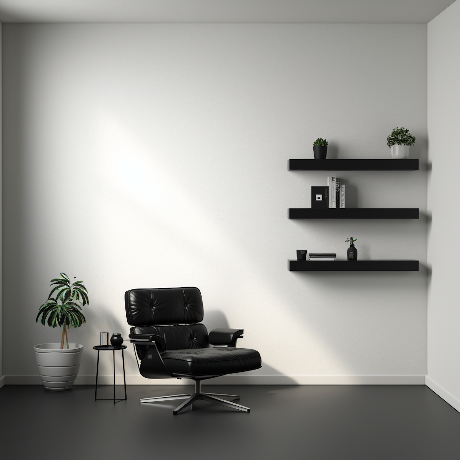 Minimalist room with black leather chair, floating shelves, and potted plant. Modern decor with sleek design and natural lighting.