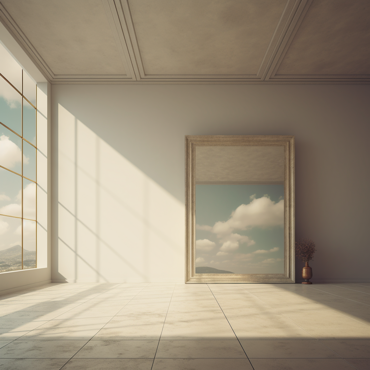 Minimalist room with large windows, sunlight, and a mirror reflecting the sky. Elegant and serene interior design.