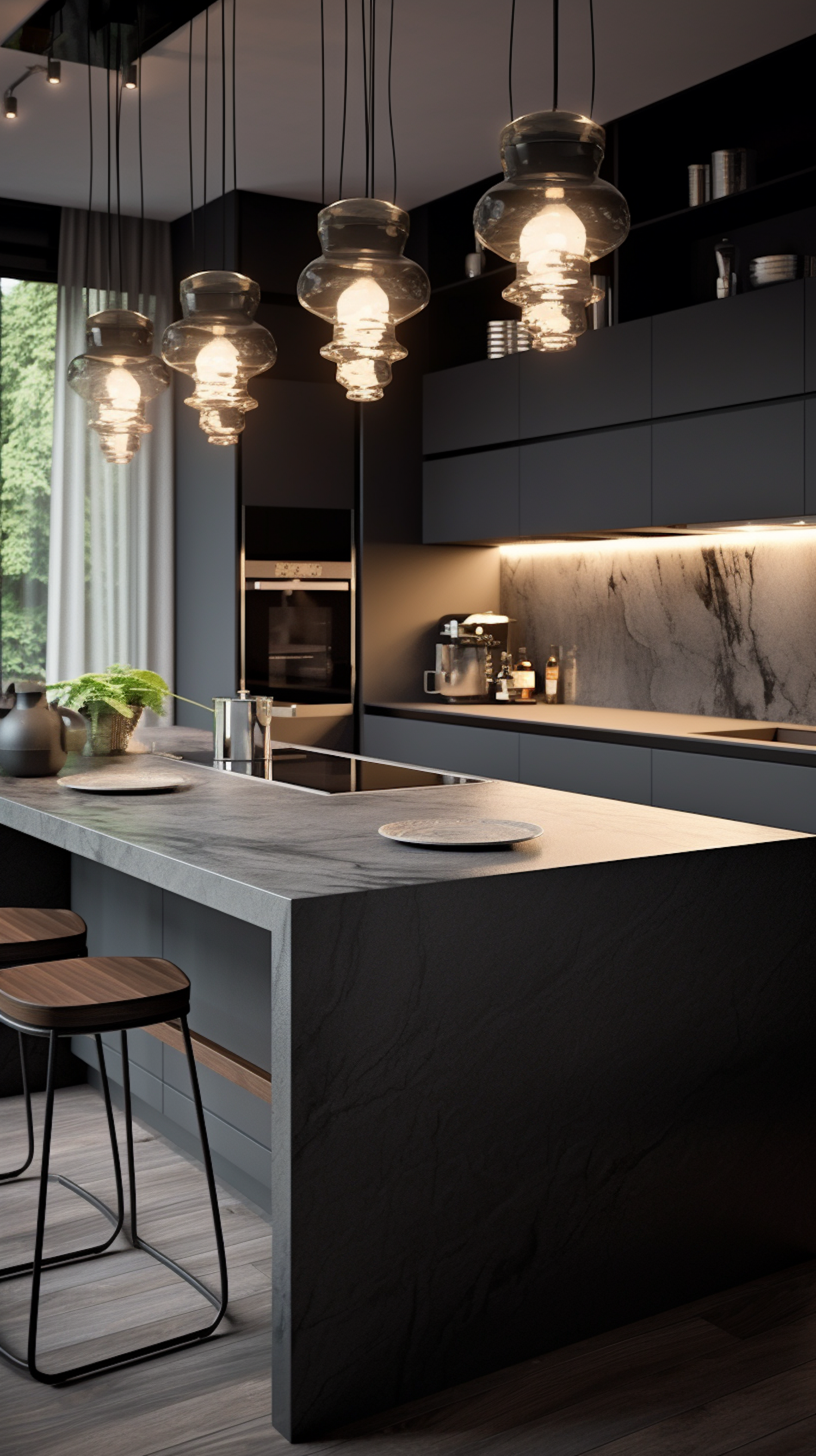 Sleek modern kitchen with dark cabinetry, marble backsplash, and pendant lighting. Features a large island and wooden bar stools.