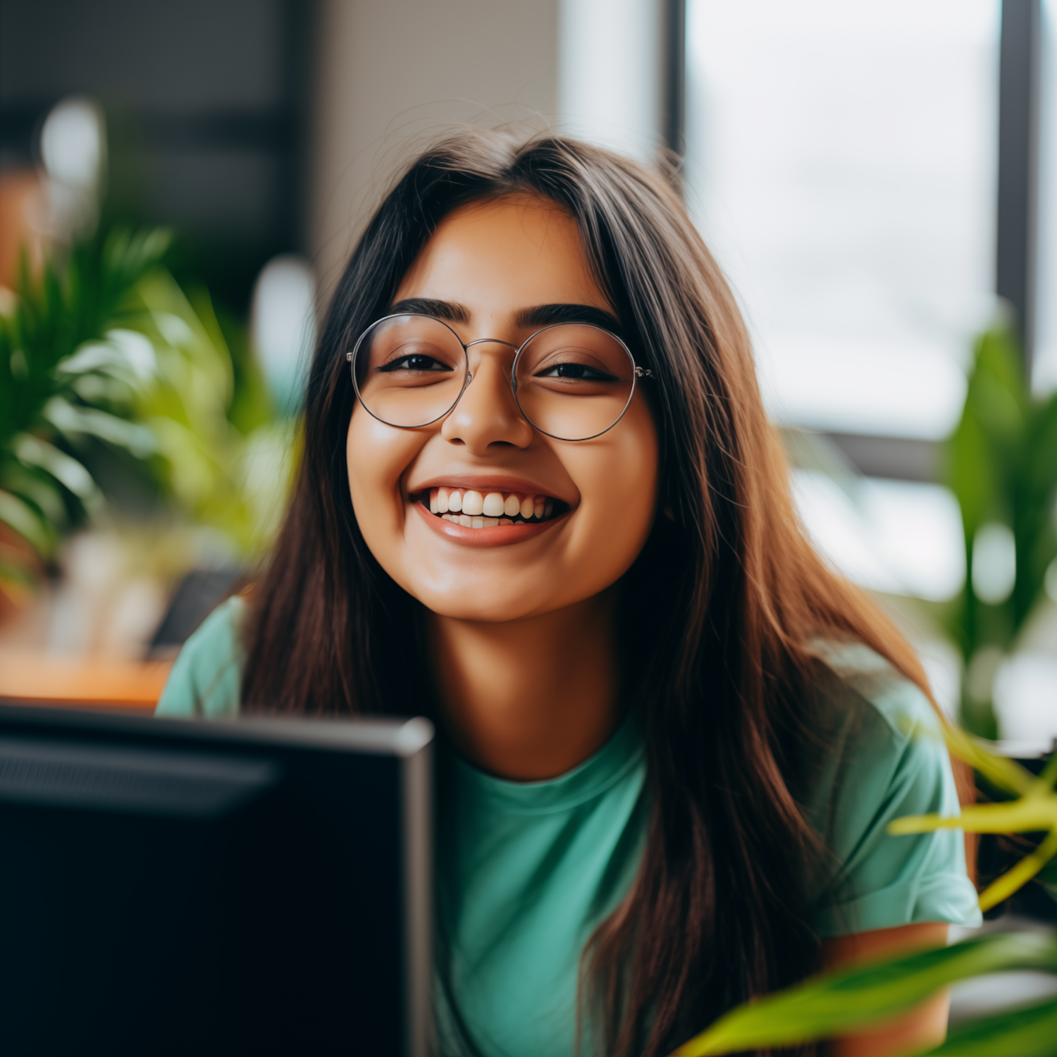 Smiling young woman with glasses and long hair, wearing a green shirt, surrounded by plants in a bright indoor setting.