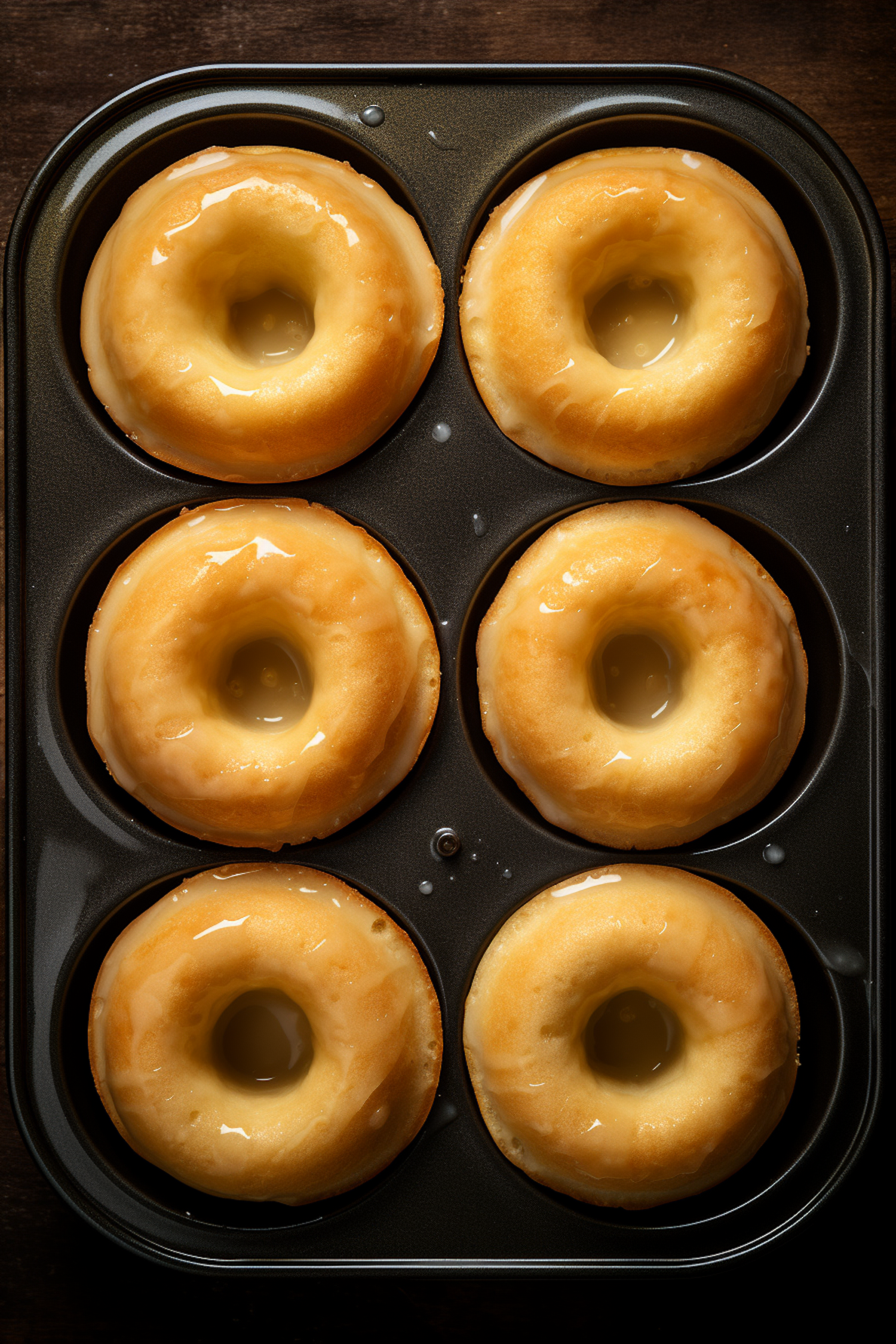 Close-up of six glazed donuts in a baking tray, golden brown and shiny, on a rustic wooden background.