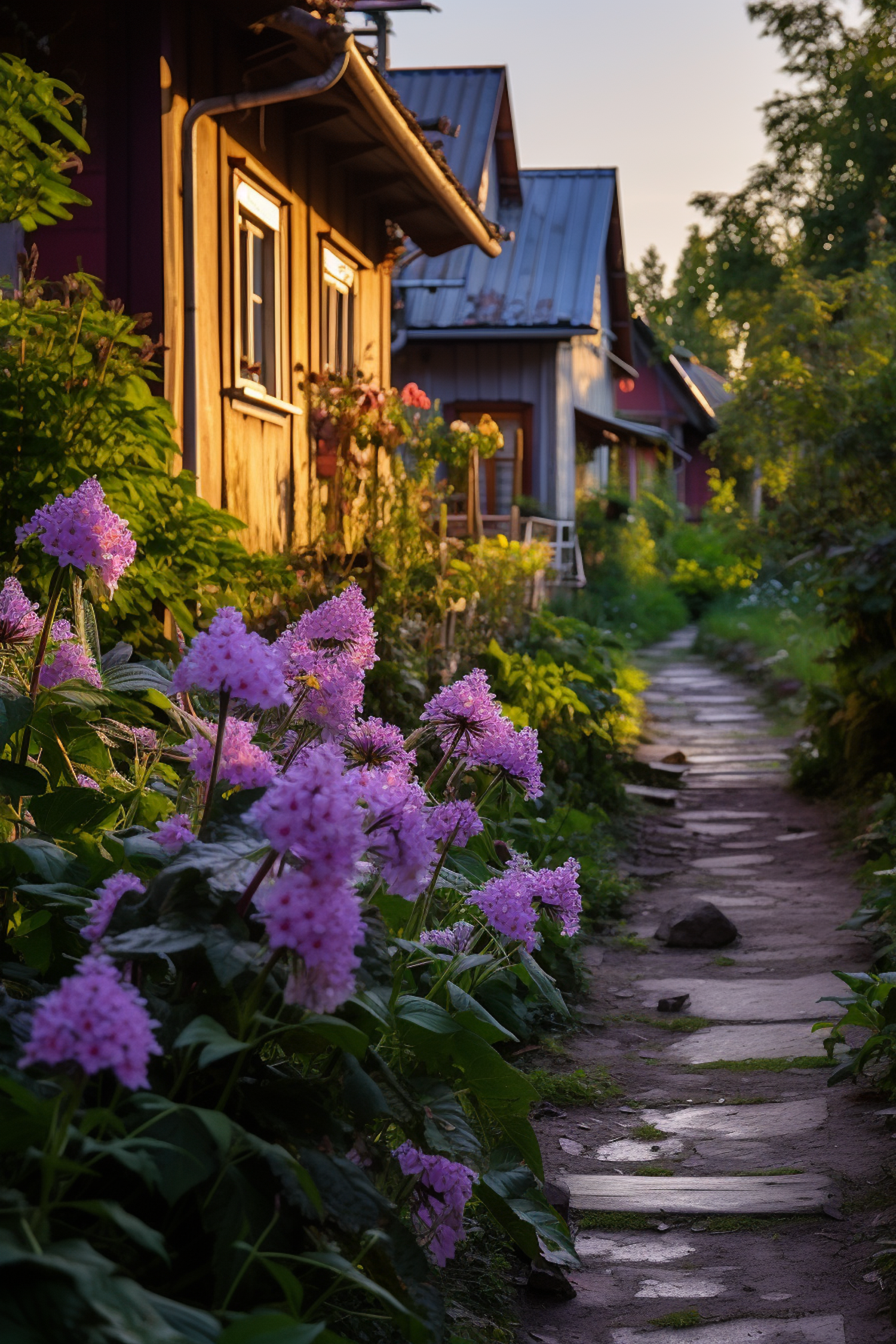 Charming garden path with pink flowers and rustic wooden houses in warm sunset light, creating a serene and idyllic rural scene.