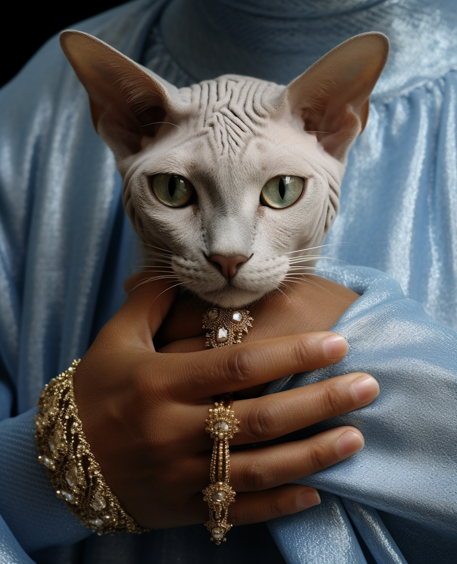 Elegant Sphynx cat held by a person in blue, adorned with intricate gold jewelry. Striking green eyes and smooth skin create a regal look.