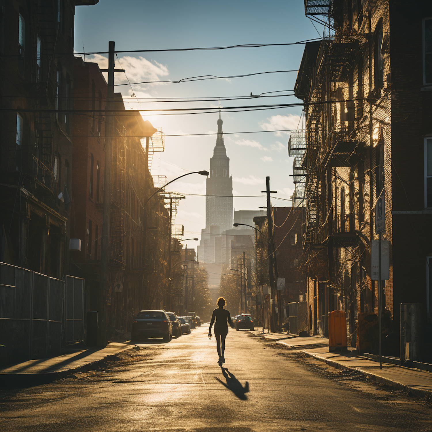 A lone figure walks down a sunlit urban street, casting a long shadow. Tall buildings and a distant skyscraper create a dramatic cityscape.