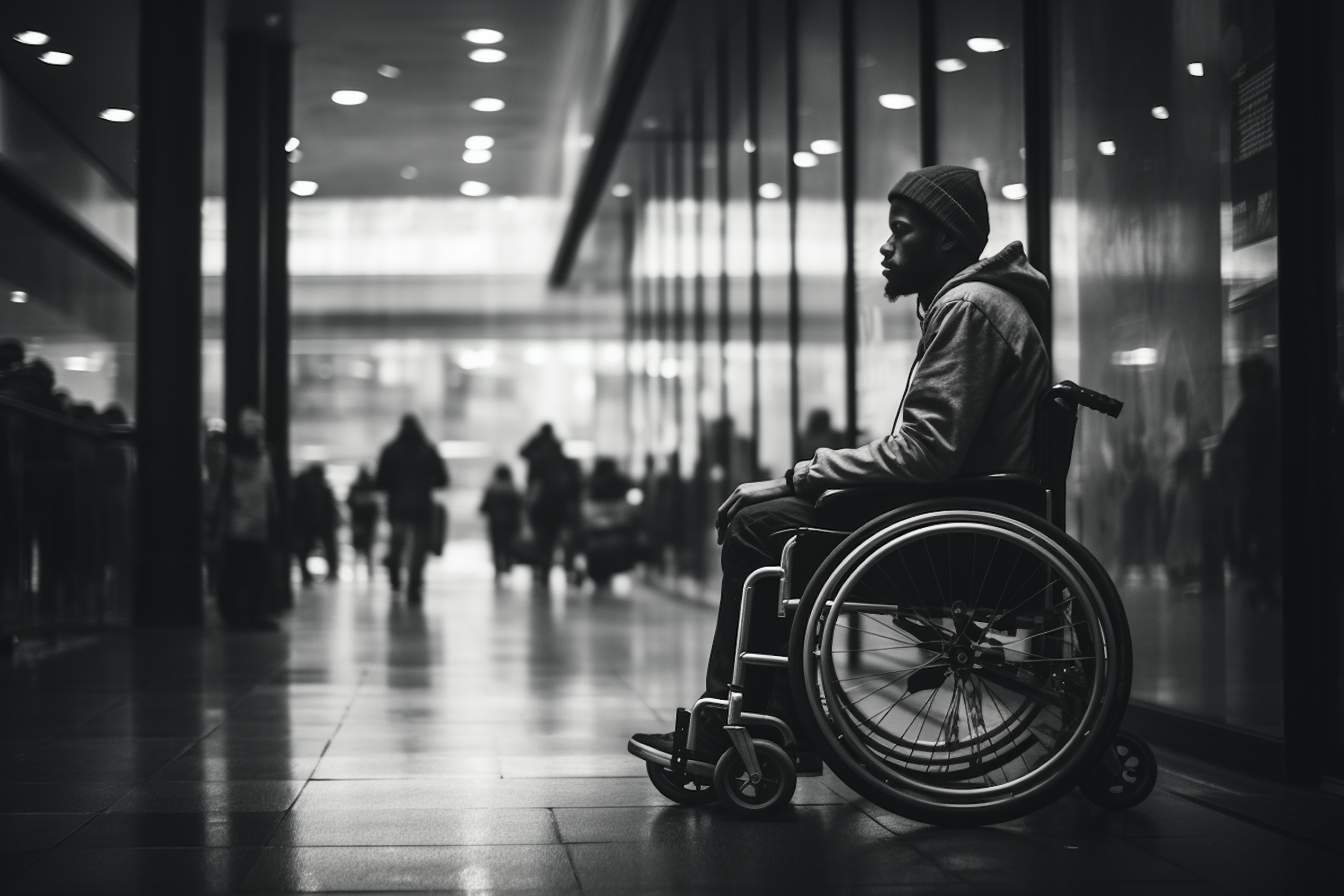 Black and white photo of a man in a wheelchair in a busy hallway, capturing a moment of stillness amidst movement.