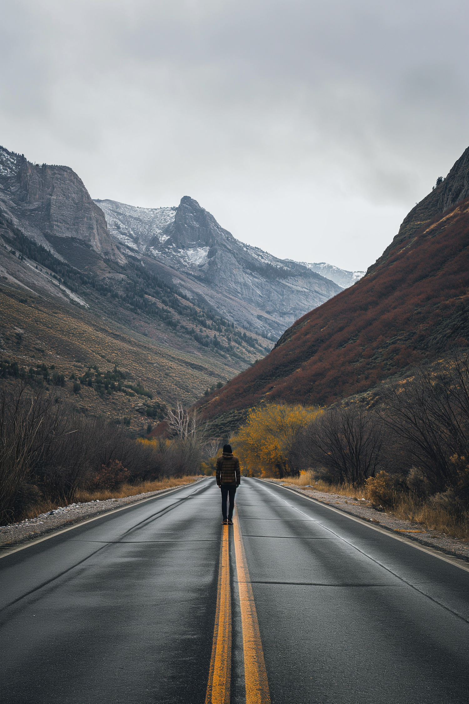 A solitary figure walks down a wet road surrounded by autumnal mountains, under an overcast sky, evoking solitude and introspection.