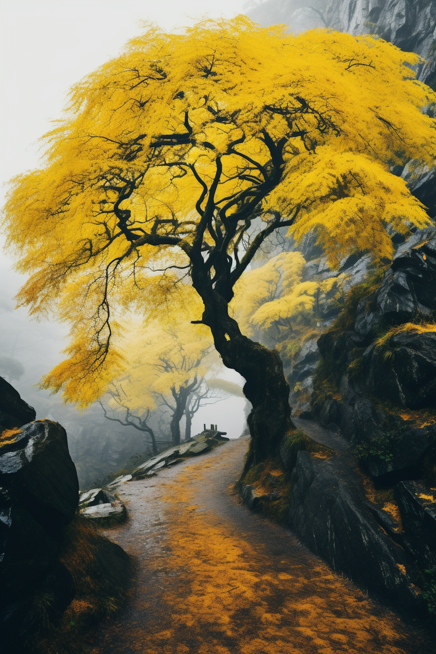 Misty path with vibrant yellow trees and rocky cliffs, creating a serene and dramatic landscape.