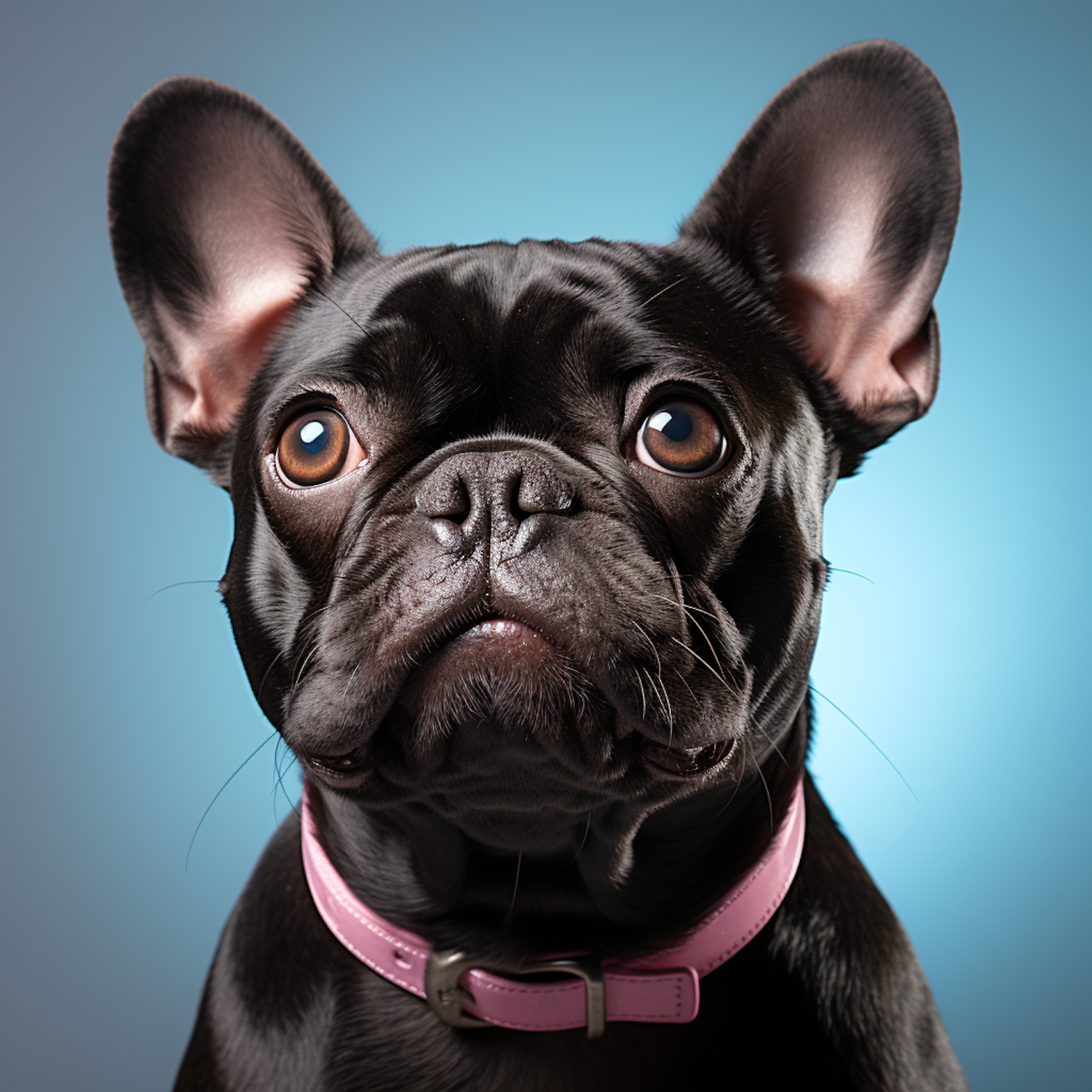 Close-up of a black French Bulldog with brown eyes and a pink collar against a blue background.