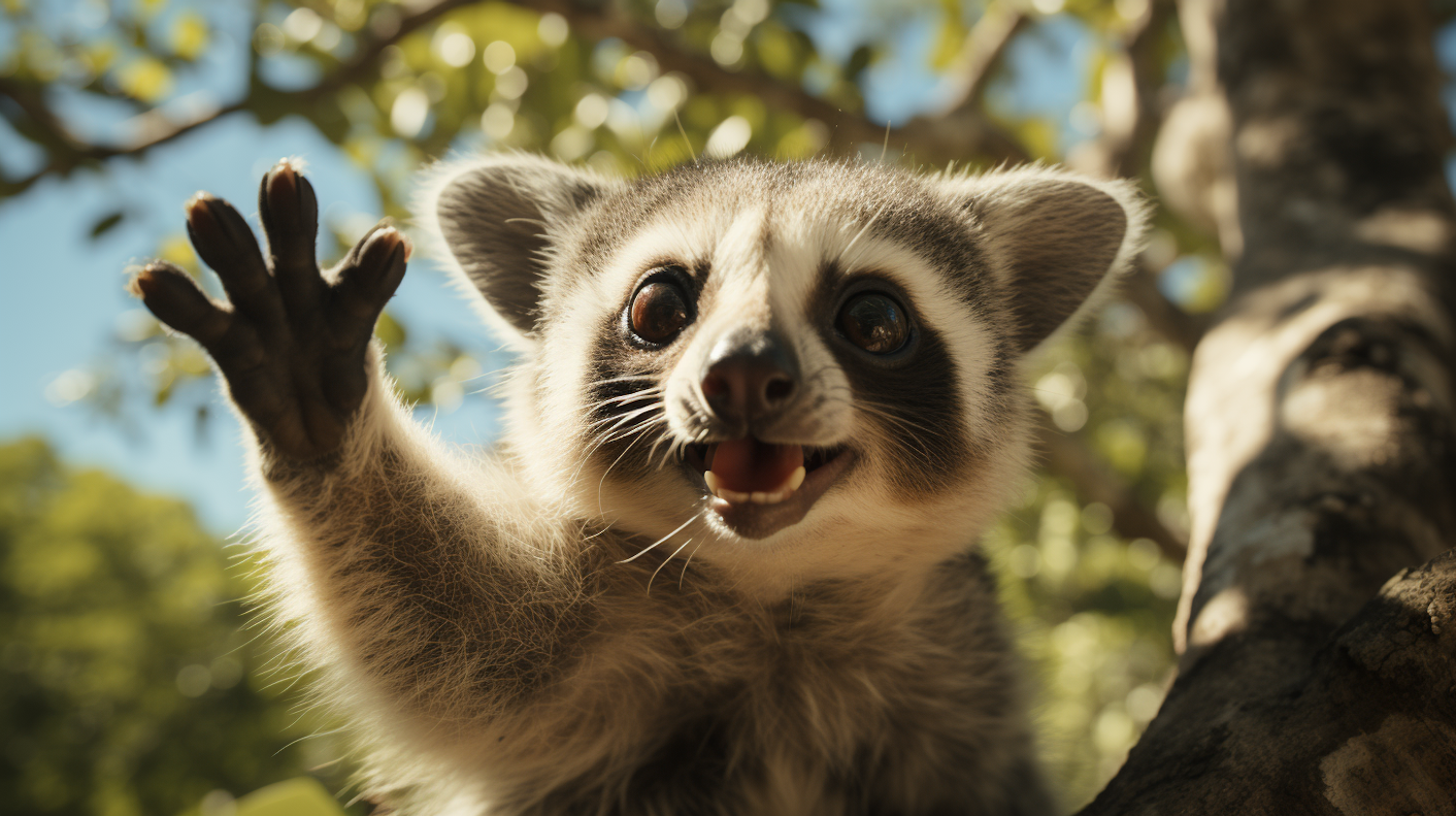Adorable young raccoon playfully reaching out with a paw, set against a sunny backdrop of green foliage and blue sky.