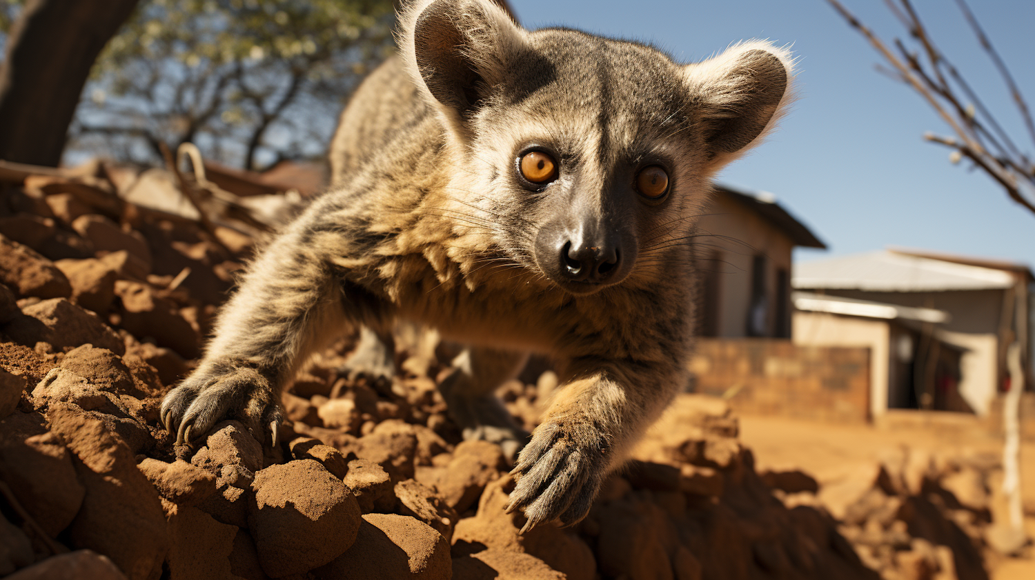 Close-up of a lemur with orange eyes climbing over rocks in a rural setting, showcasing its natural habitat and curious expression.