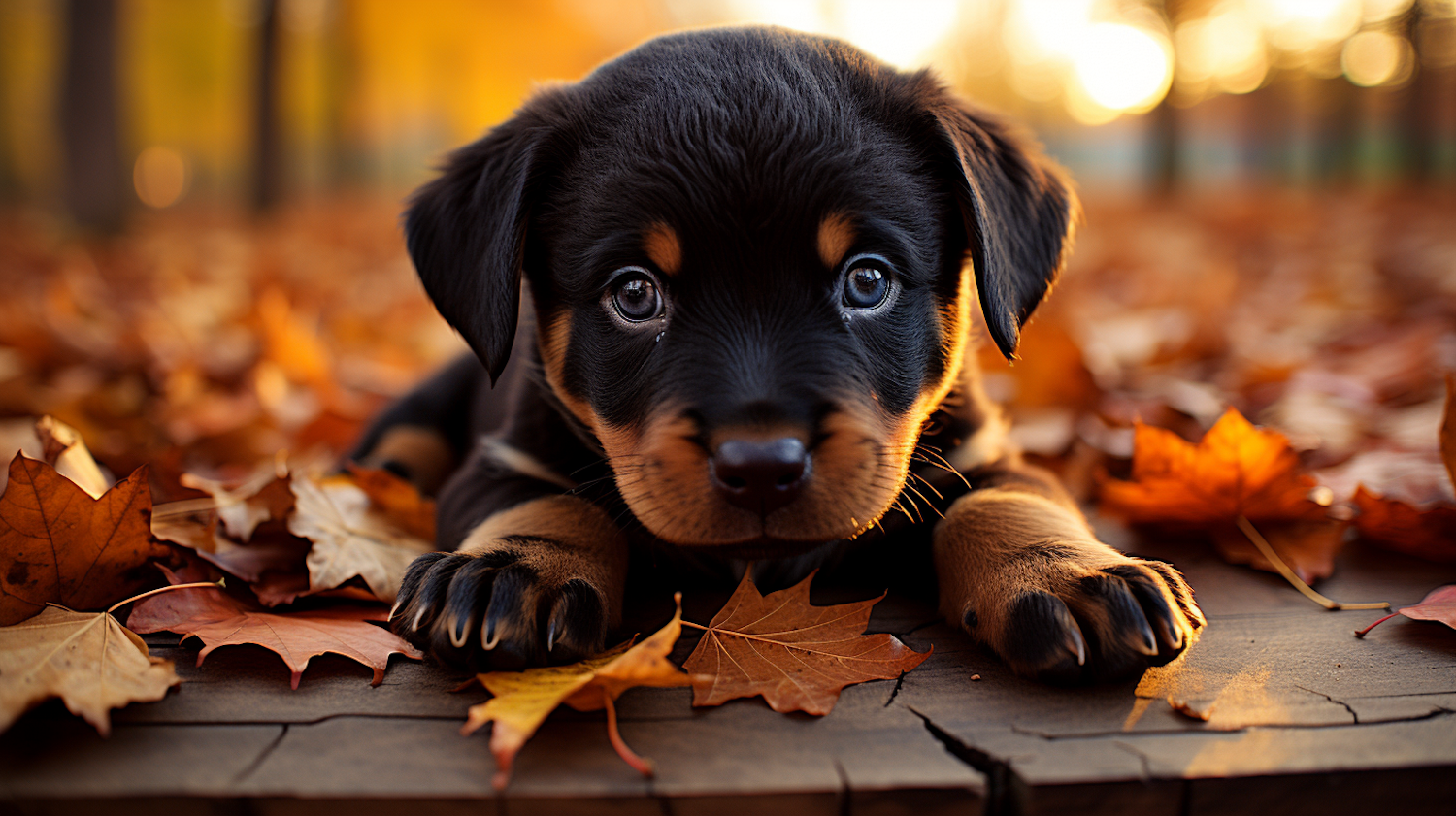 Adorable Rottweiler puppy lying on autumn leaves, with warm golden tones and a cozy fall atmosphere.