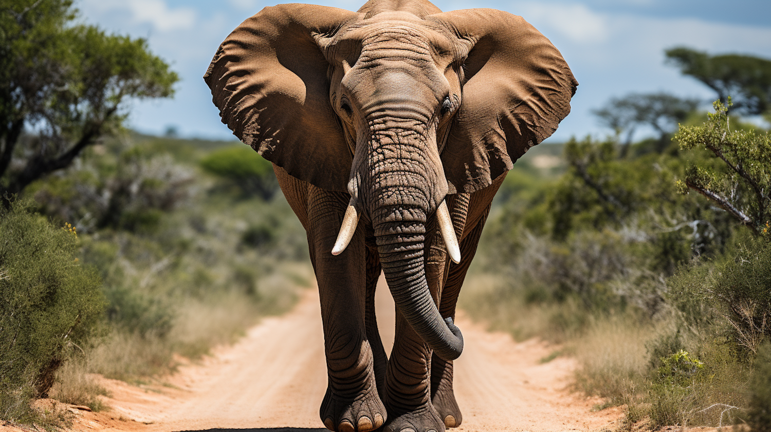 Majestic African elephant walking down a dusty path, showcasing its massive ears and gleaming tusks against a blurred savannah backdrop.