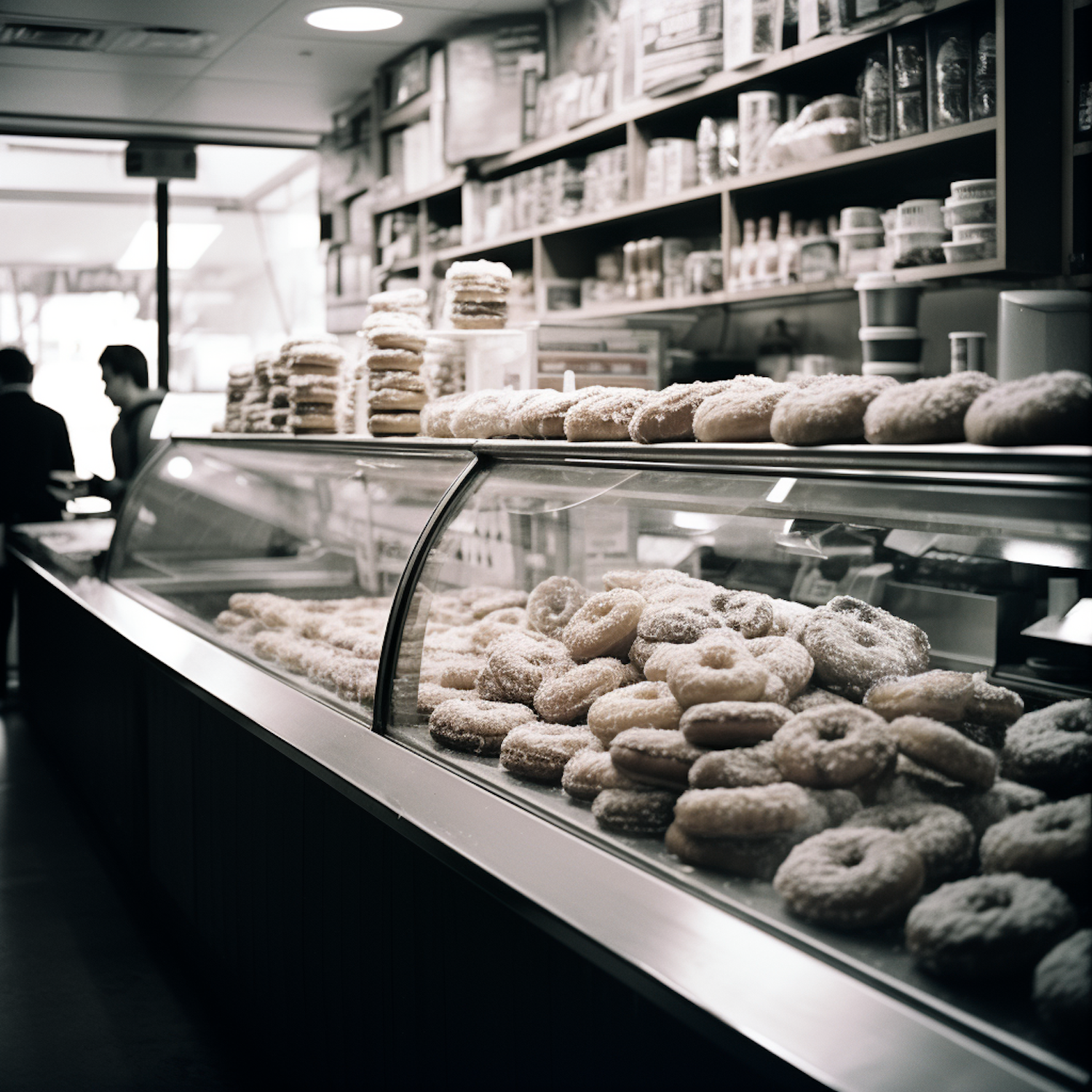 A bakery display case filled with powdered sugar donuts, creating a warm and inviting atmosphere with a bustling background.