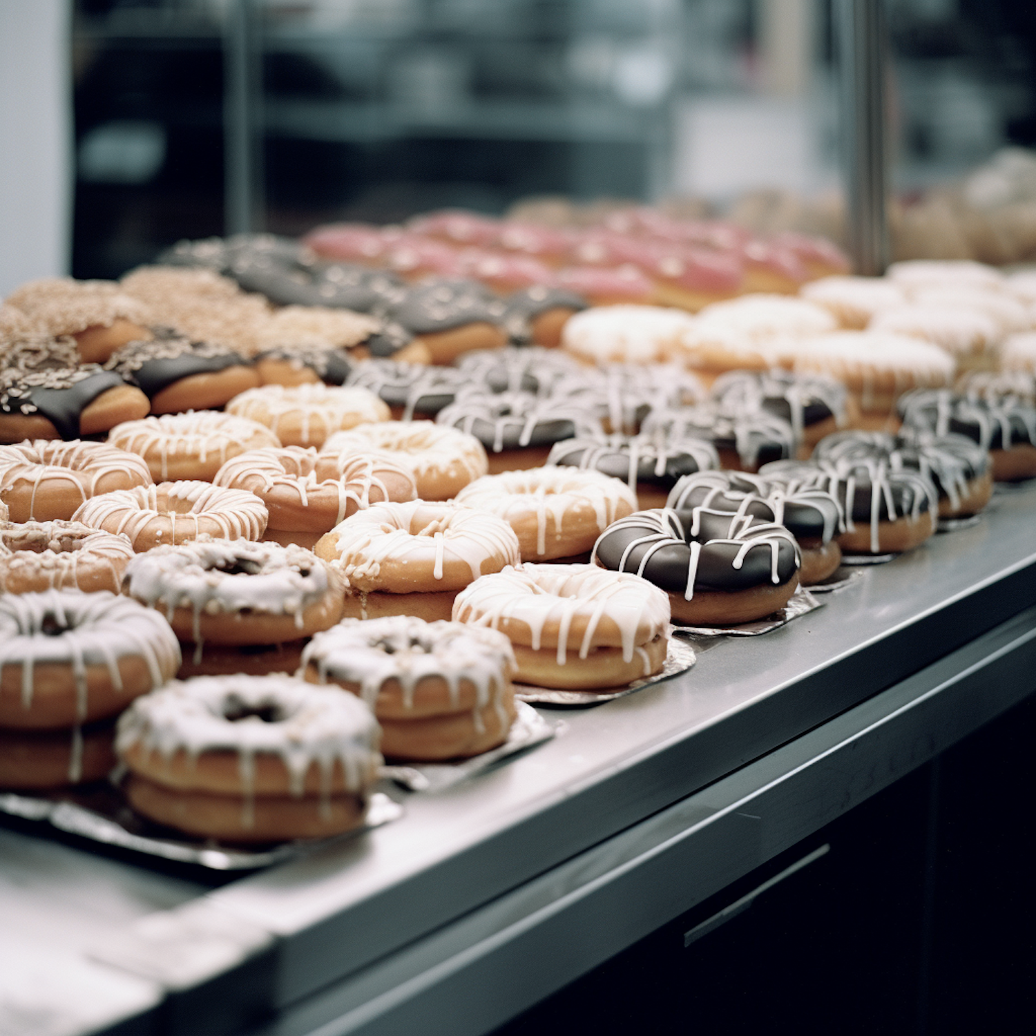 A tempting array of assorted donuts with chocolate, white icing, and sprinkles on a bakery counter.