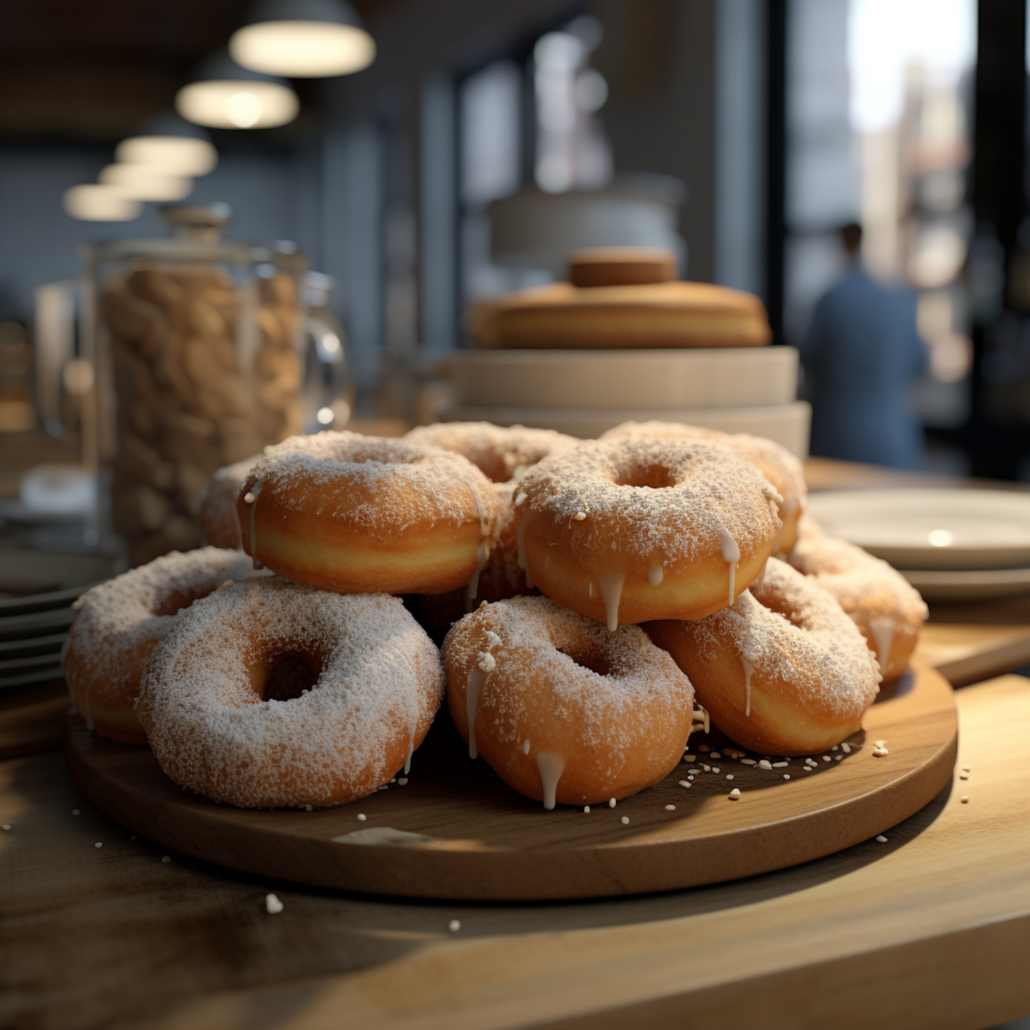 A stack of golden brown donuts dusted with powdered sugar on a wooden platter in a cozy café setting.