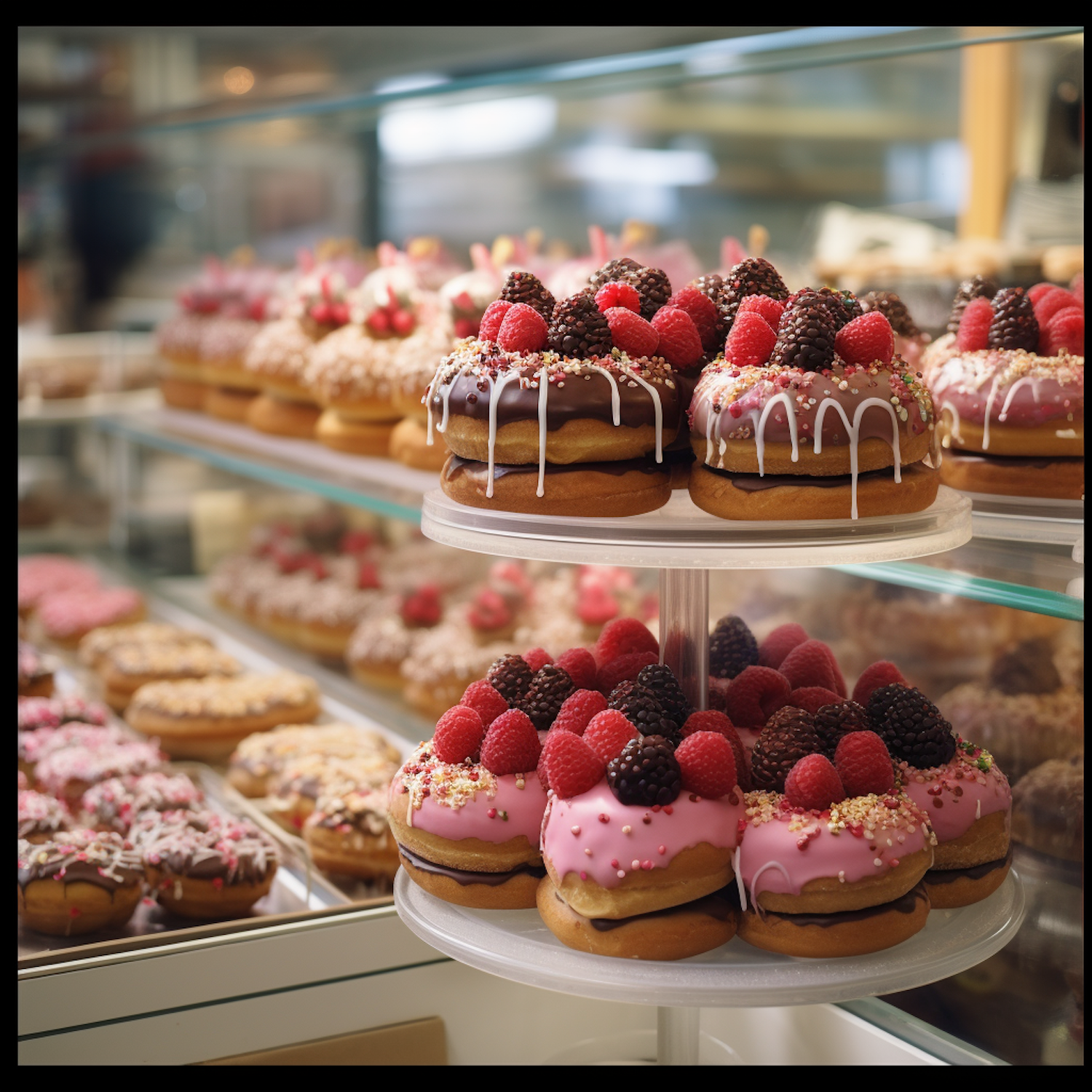 Vibrant donuts with pink icing, fresh berries, and sprinkles on display in a bakery. Tempting and colorful sweet treats.