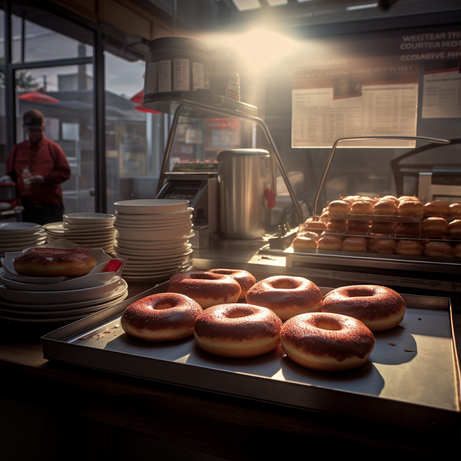 Golden sunlight illuminates freshly glazed donuts in a cozy bakery setting, with stacks of plates and a staff member in the background.