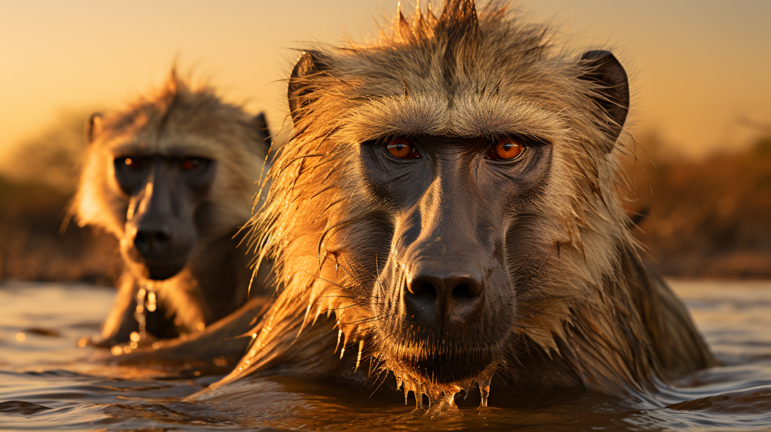 Two baboons in water at sunset, with golden light highlighting their wet fur and amber eyes, creating a serene and natural scene.