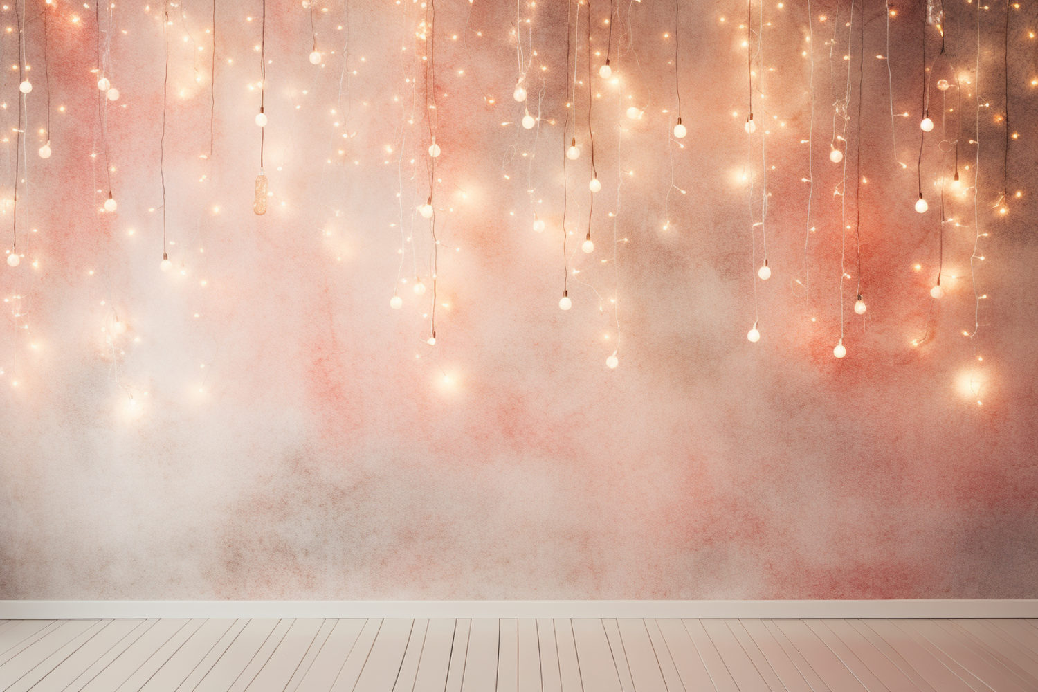Dreamy scene with pastel pink backdrop and warm white fairy lights hanging, creating a whimsical and serene atmosphere.
