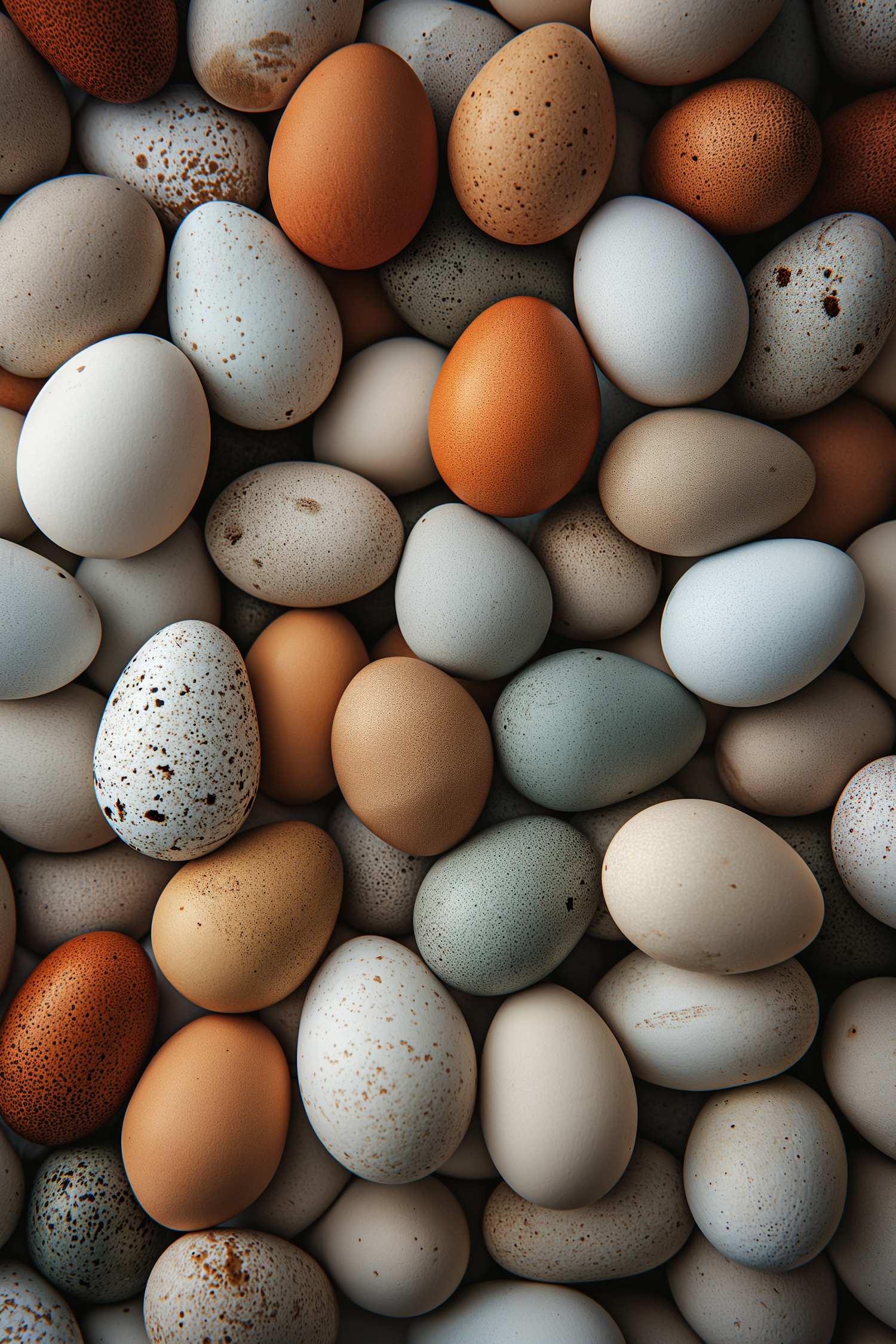 A colorful assortment of eggs in various shades and speckled patterns, showcasing natural diversity and texture in a close-up view.