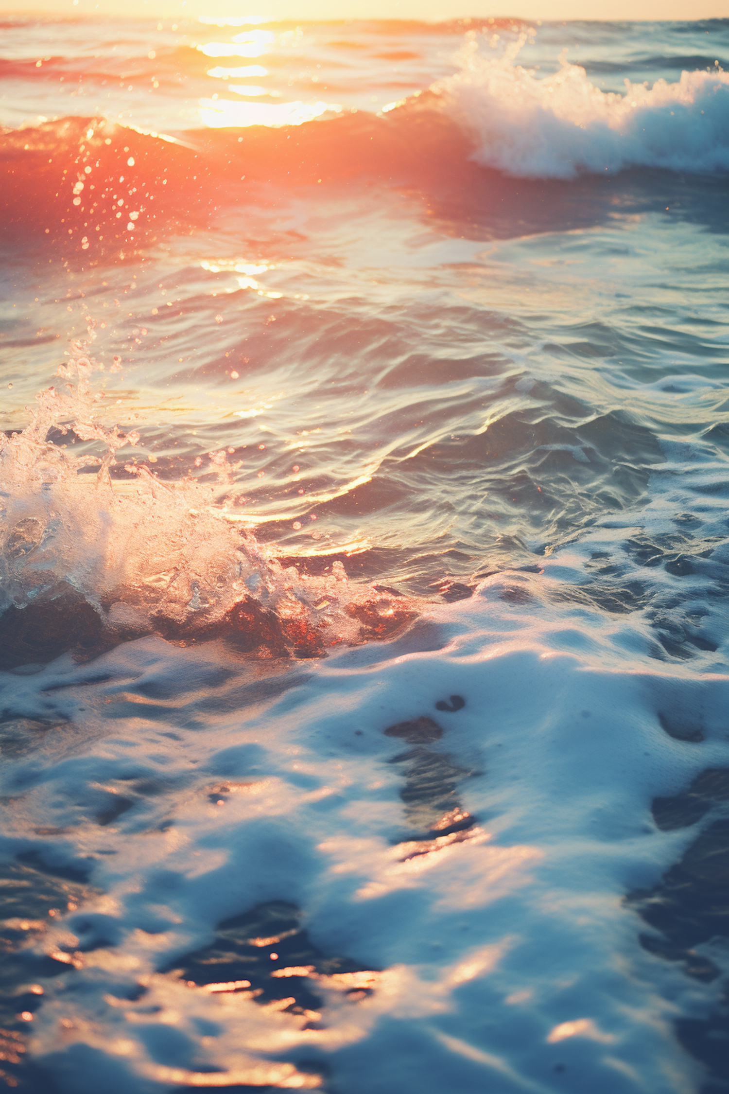 Golden sunset over ocean waves, with shimmering water and foamy crests, creating a serene and captivating seascape.