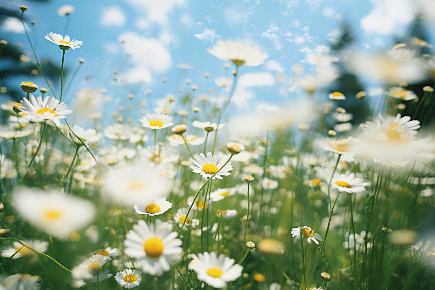 A dreamy meadow of white daisies under a bright blue sky with fluffy clouds, creating a serene and cheerful atmosphere.