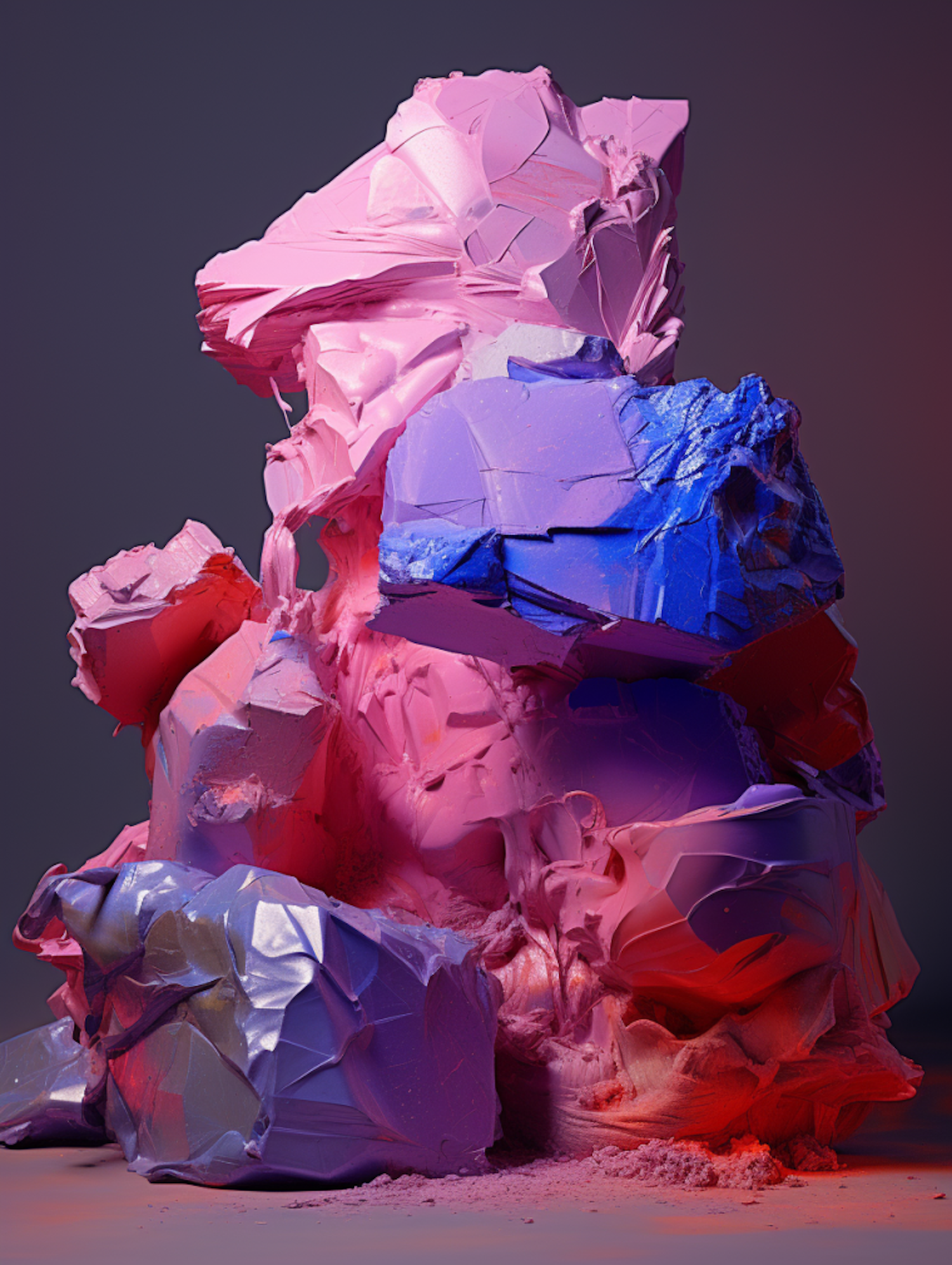 Vibrant abstract sculpture with jagged forms in pink, blue, and purple hues, set against a muted gray background.