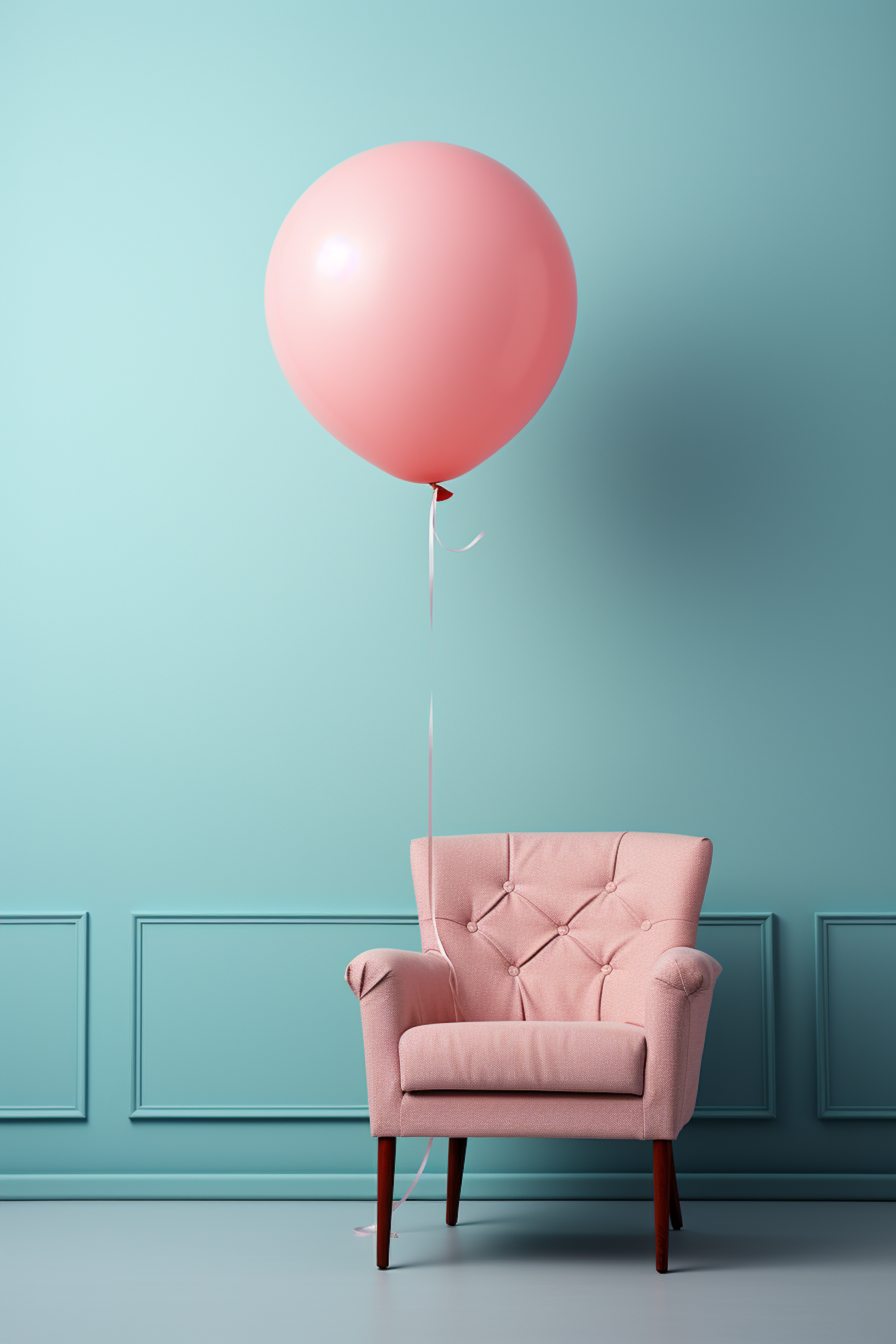 A pink balloon tied to a plush pink armchair against a pastel teal wall, creating a whimsical and minimalistic scene.