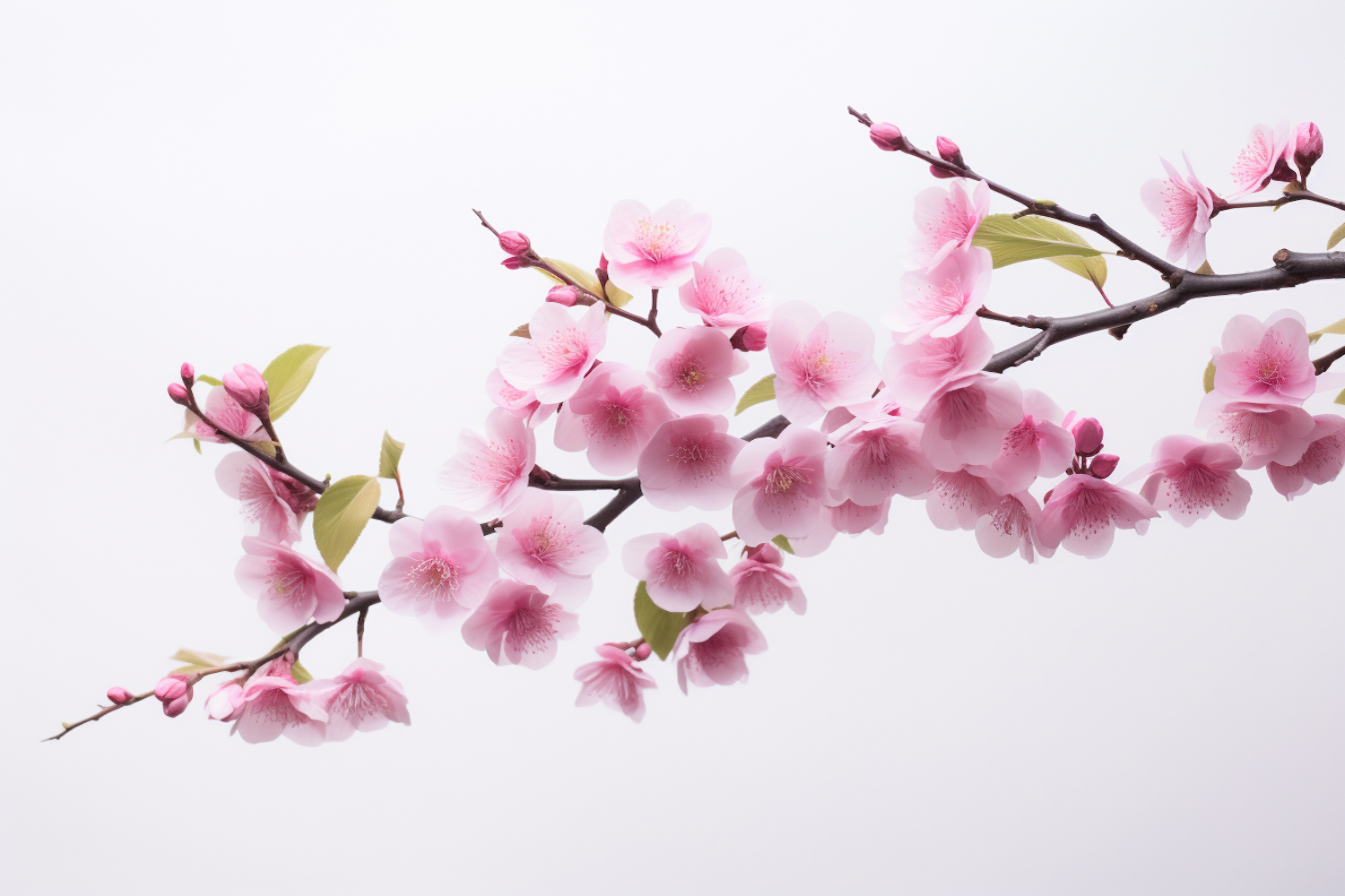 A branch of cherry blossoms with soft pink flowers against a white background, highlighting their delicate beauty and elegance.