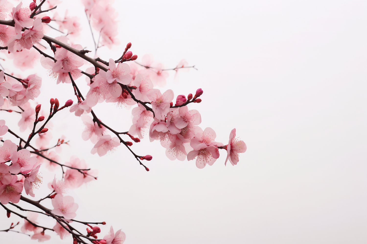 Beautiful cherry blossom branches with soft pink flowers against a muted white background, capturing the essence of spring.