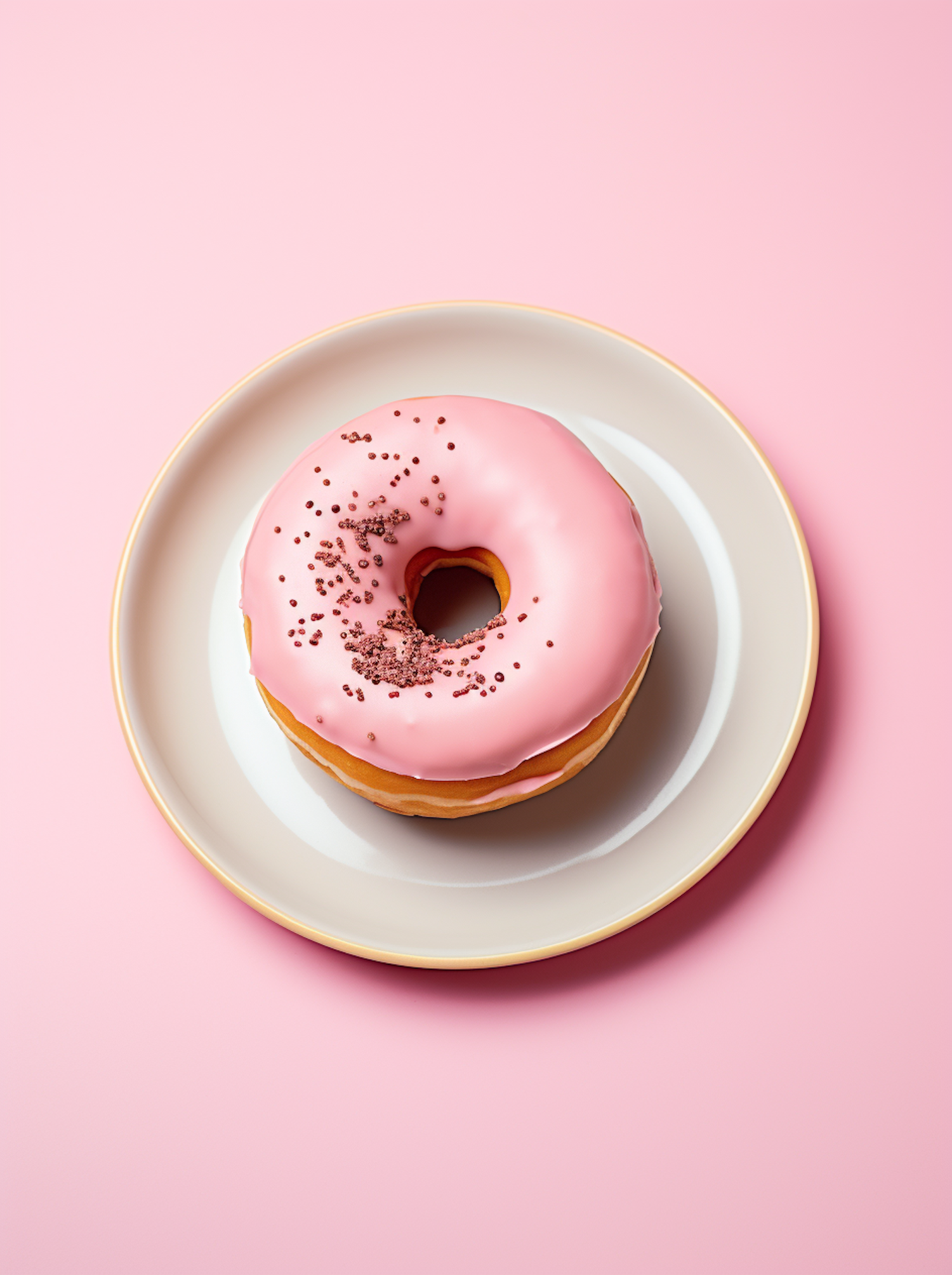 Delicious pink-iced donut with chocolate sprinkles on a white plate, set against a pastel pink background.