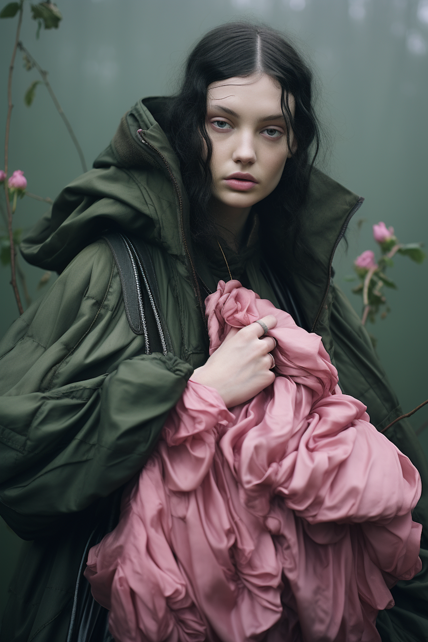 Young woman in green puffer jacket holding pink fabric, surrounded by soft green and pink floral background.