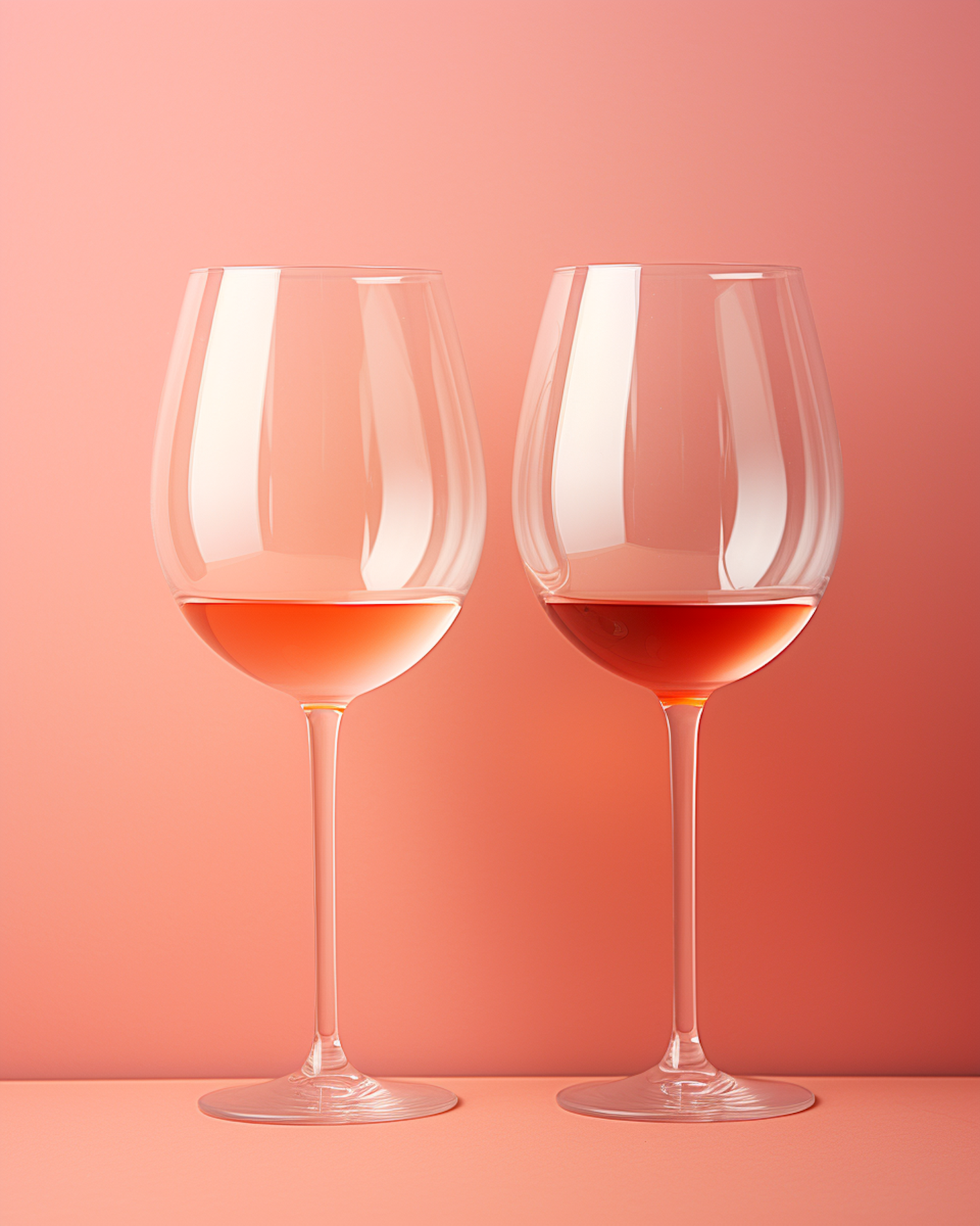 Two wine glasses with pink rosé wine against a peach background, creating a minimalistic and elegant aesthetic.
