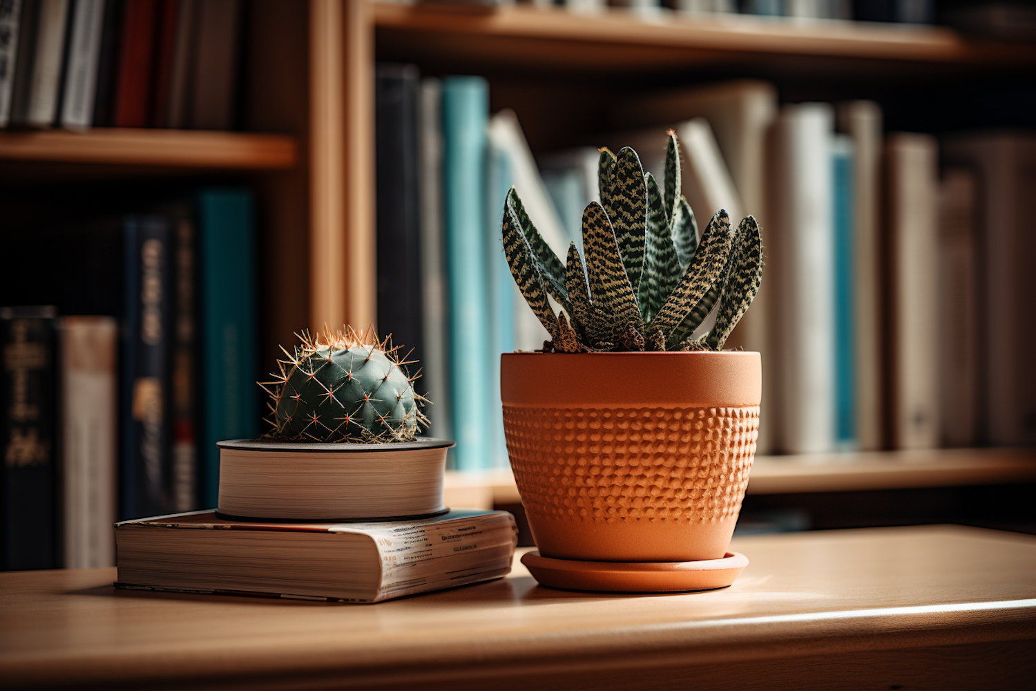 Cozy indoor scene with a cactus on books and a succulent in a terracotta pot, set against a blurred bookshelf background.