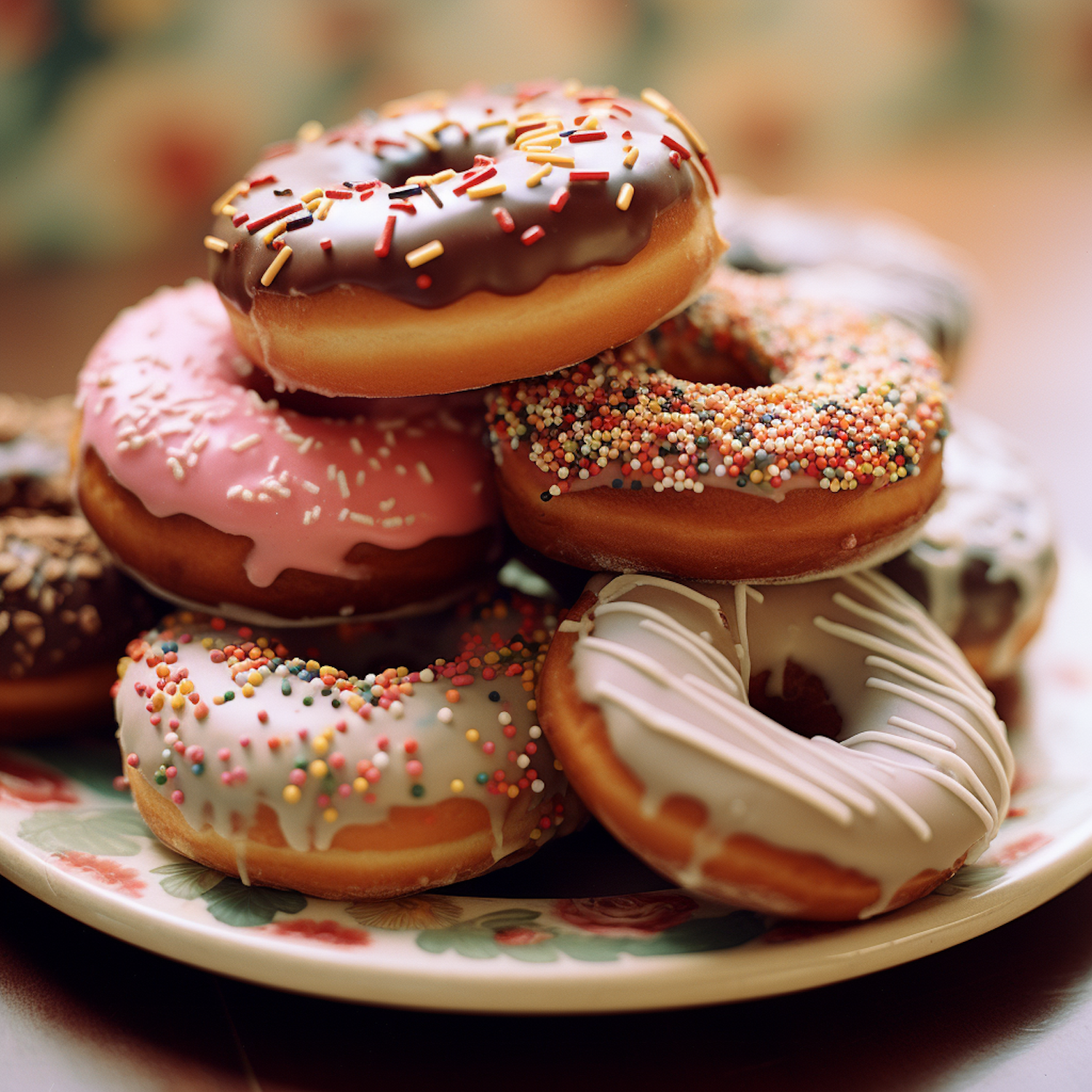 A tempting assortment of colorful glazed donuts with sprinkles on a floral plate, perfect for a sweet treat.