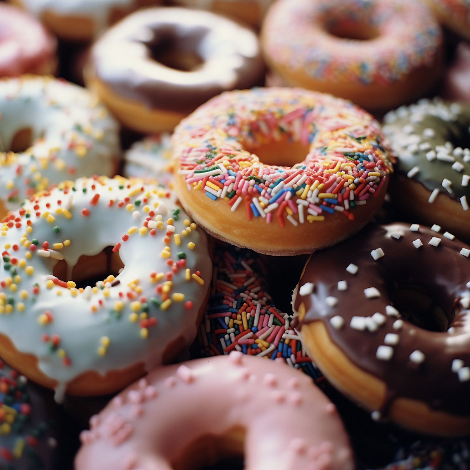 Colorful donuts with sprinkles and icing, featuring chocolate, pink, and white toppings. A tempting treat for any sweet tooth.