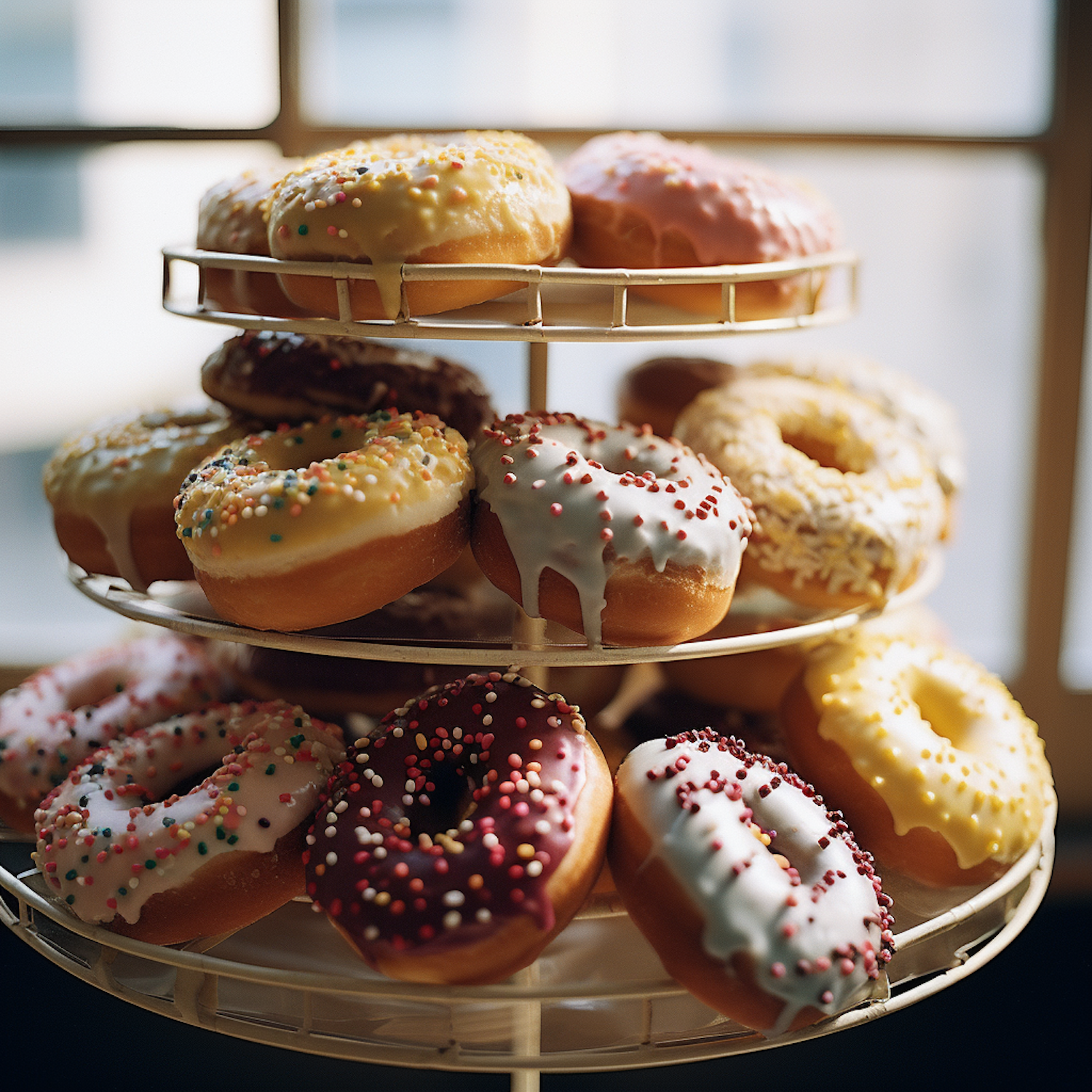 A tiered stand of colorful, sprinkled donuts with vibrant icing, bathed in warm sunlight from a nearby window.