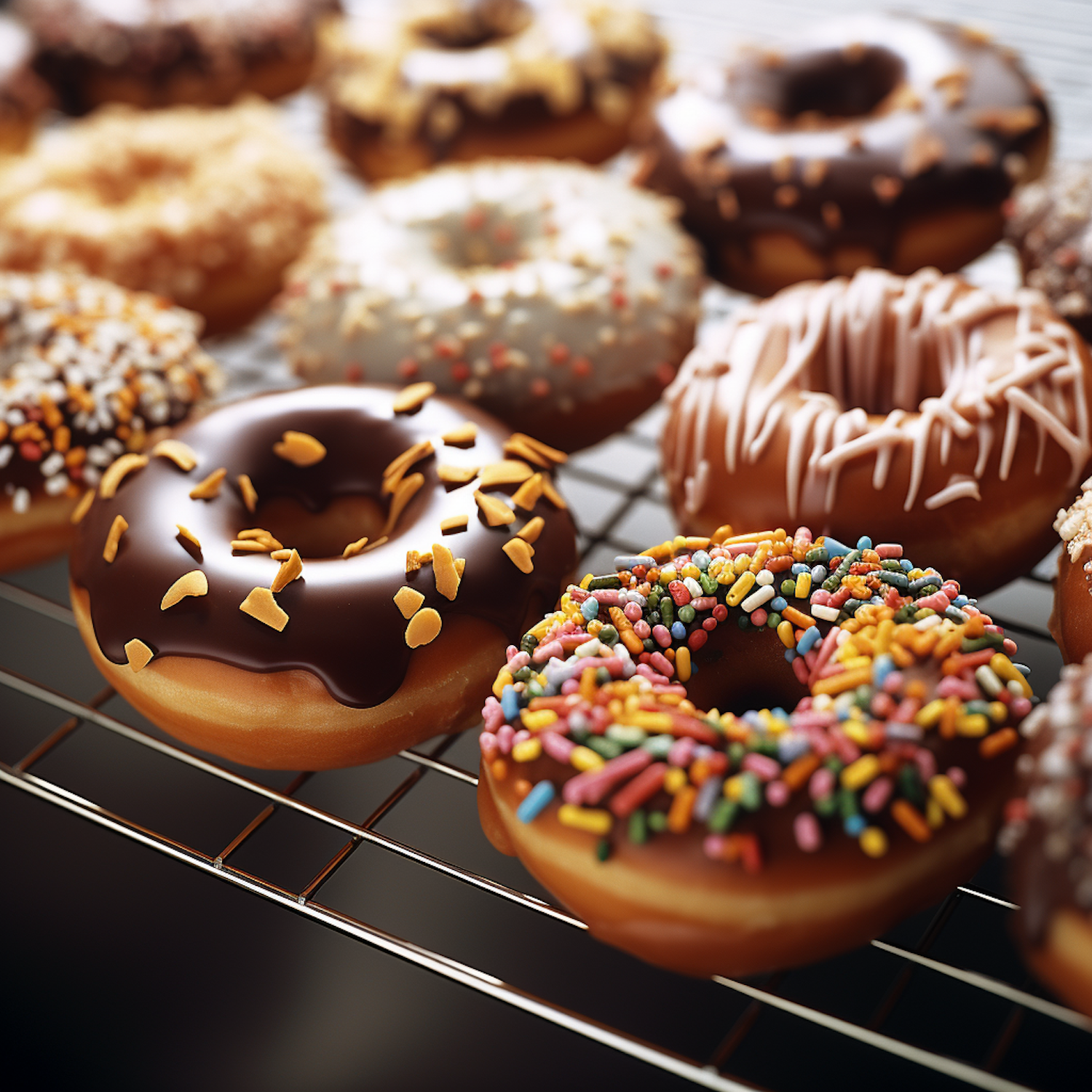 A tempting assortment of colorful donuts with various toppings on a cooling rack, featuring chocolate glaze and rainbow sprinkles.