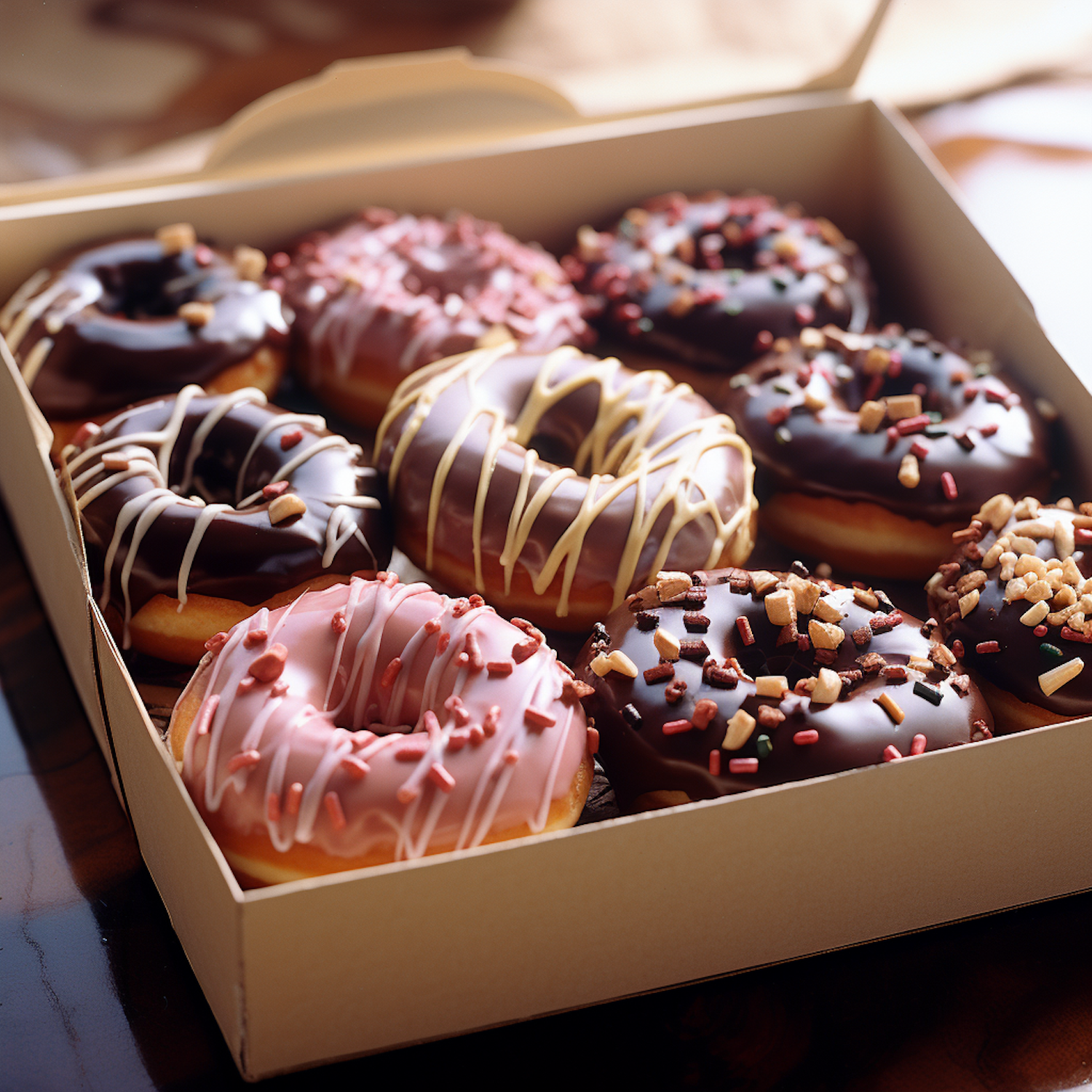 A tempting box of assorted donuts with chocolate, pink icing, and sprinkles, perfect for a sweet treat.
