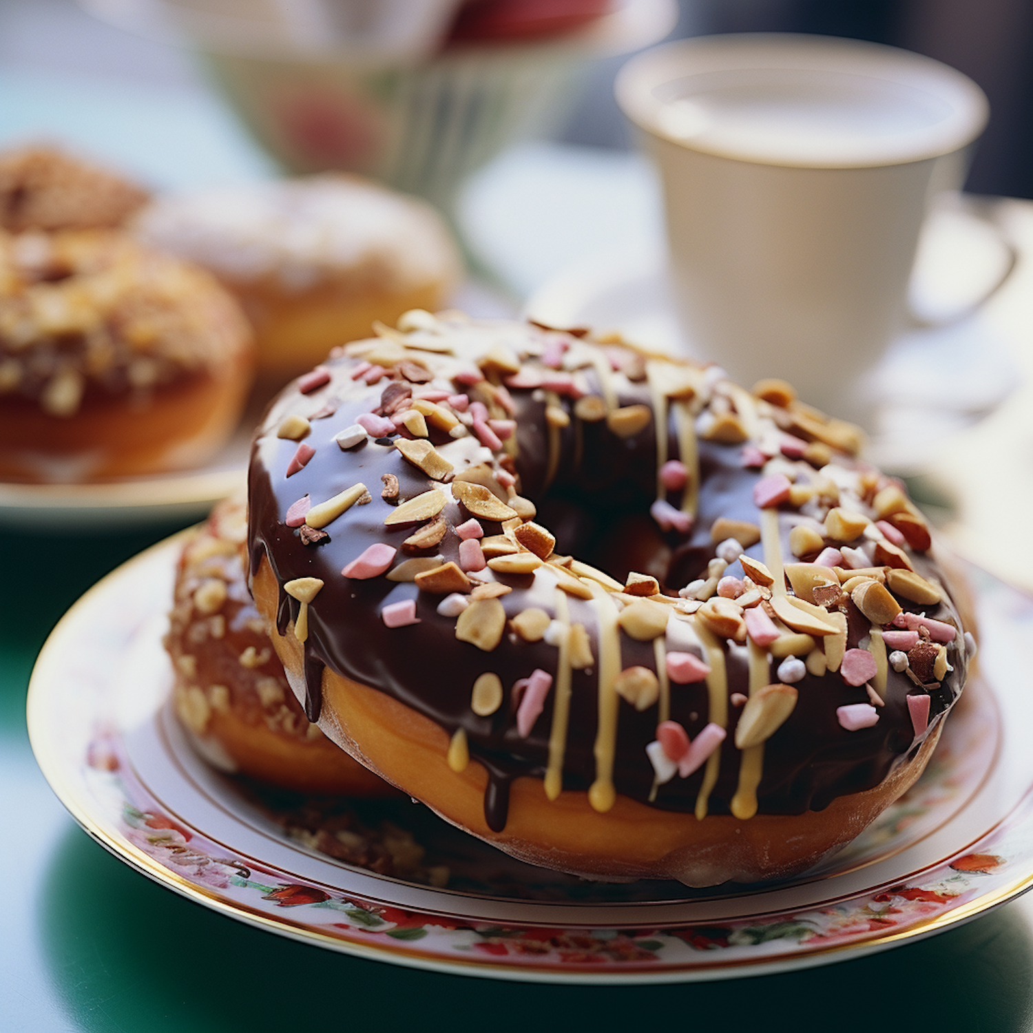 Close-up of a chocolate-glazed donut with colorful sprinkles on a floral plate, accompanied by a cup of coffee in a cozy setting.