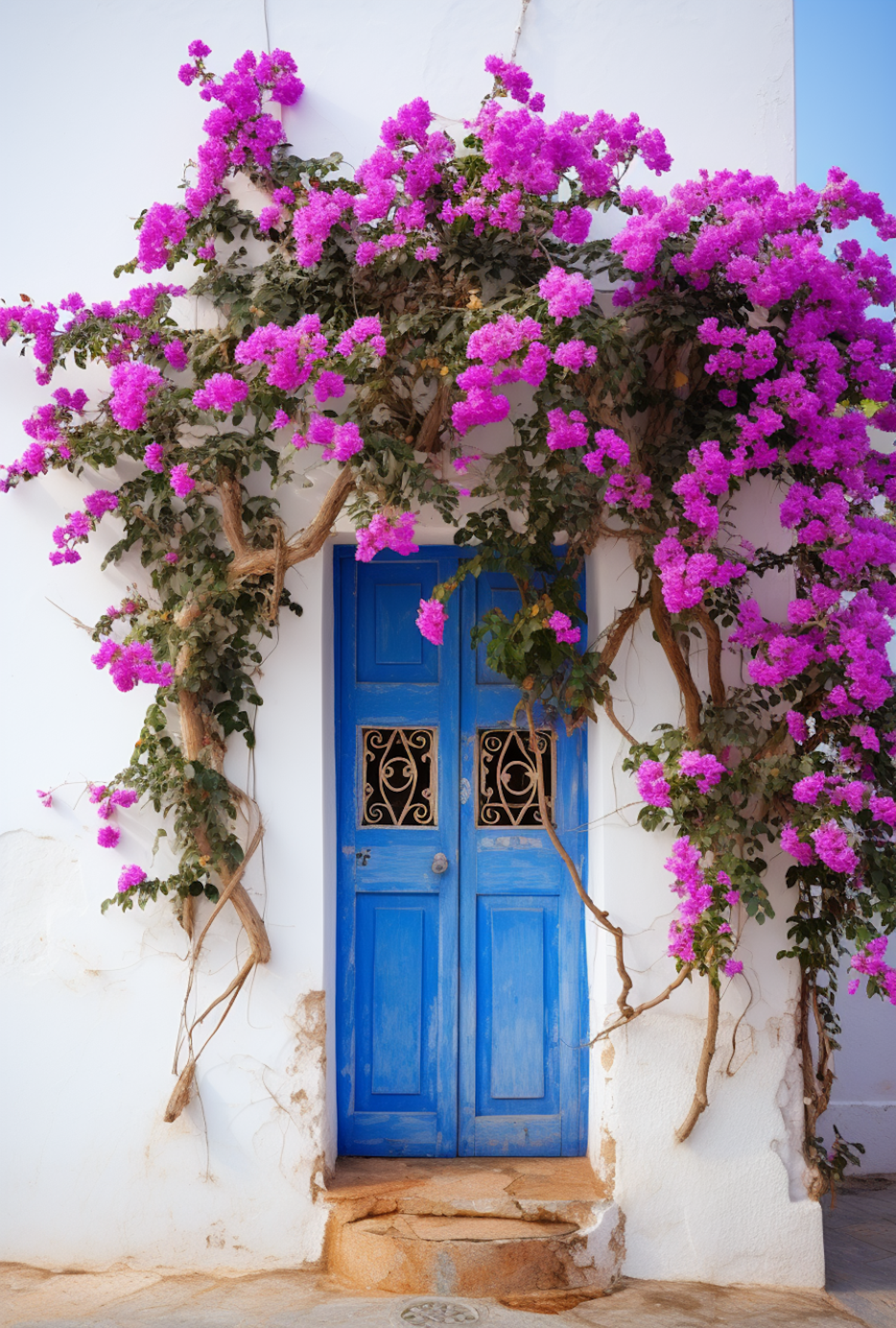 Charming blue door framed by vibrant pink bougainvillea on a white wall, exuding Mediterranean allure and rustic elegance.
