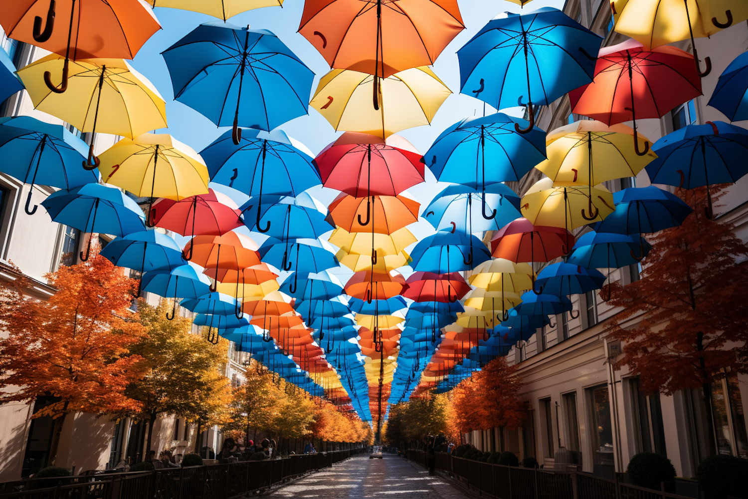 Colorful umbrellas suspended above a street lined with autumn trees, creating a vibrant and inviting urban scene.
