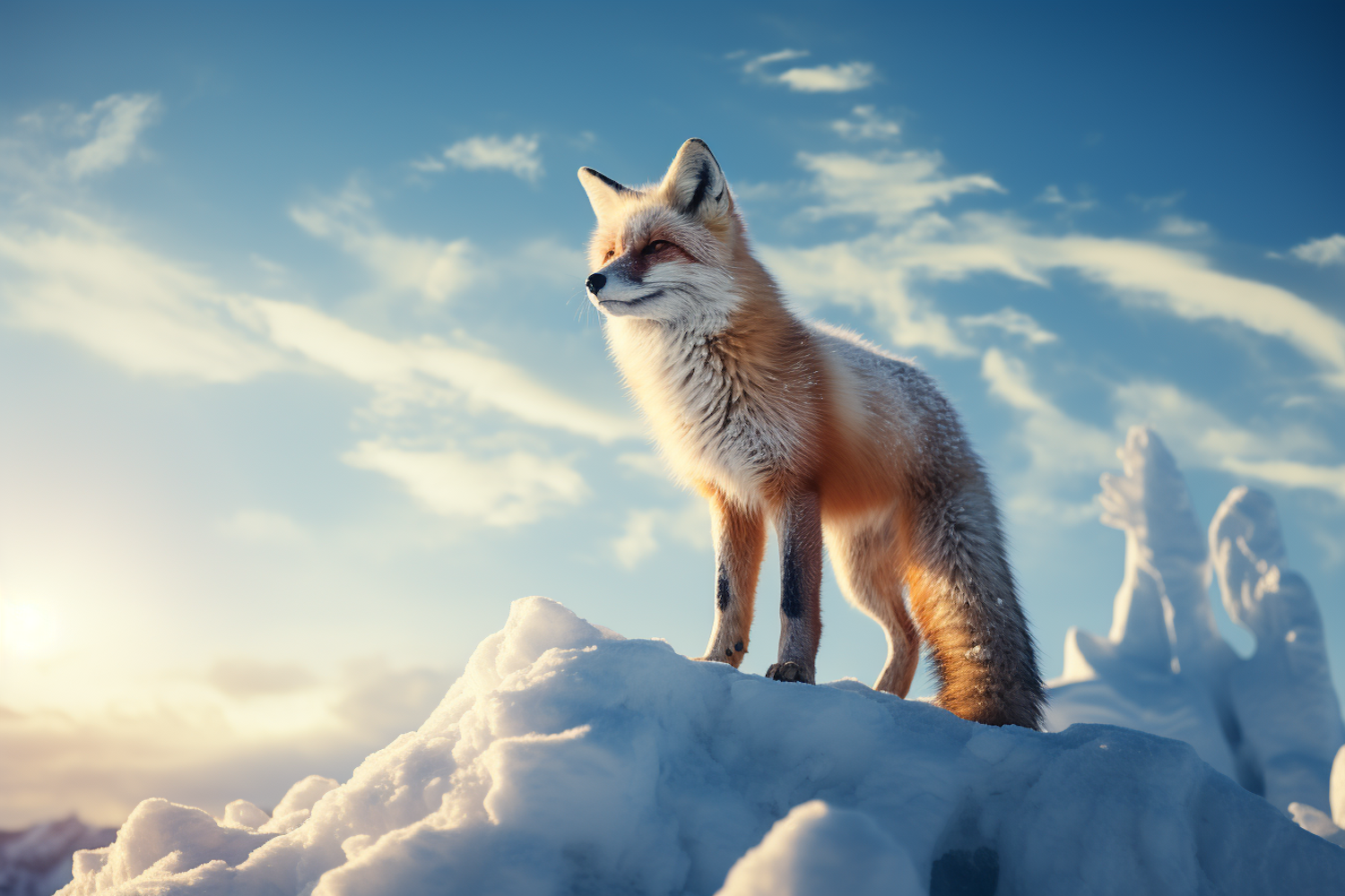 Majestic red fox on a snowy hill under a blue sky, exuding elegance and alertness in a serene winter landscape.