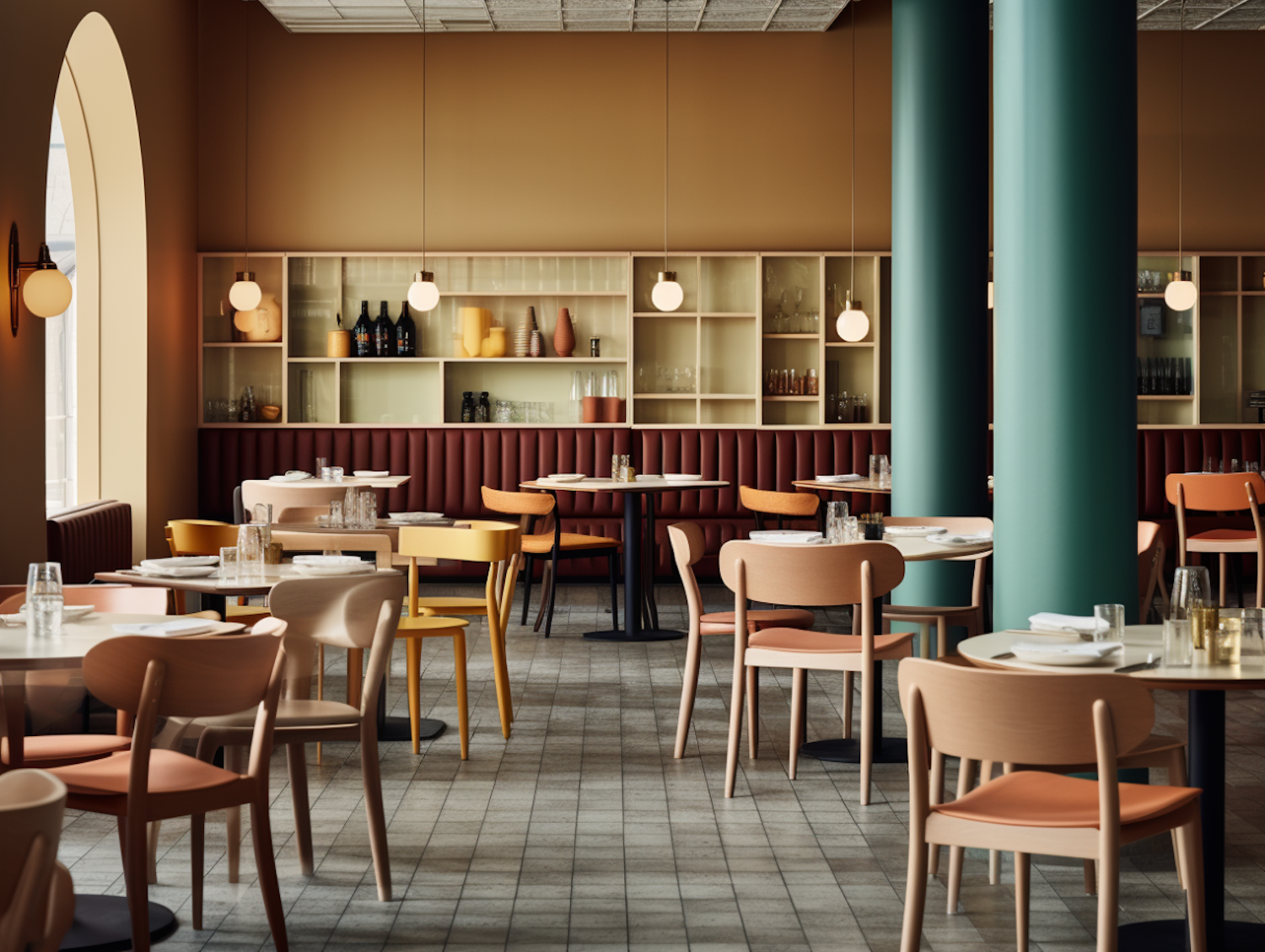 Modern restaurant interior with warm tones, wooden chairs, teal columns, and pendant lighting for a cozy dining experience.