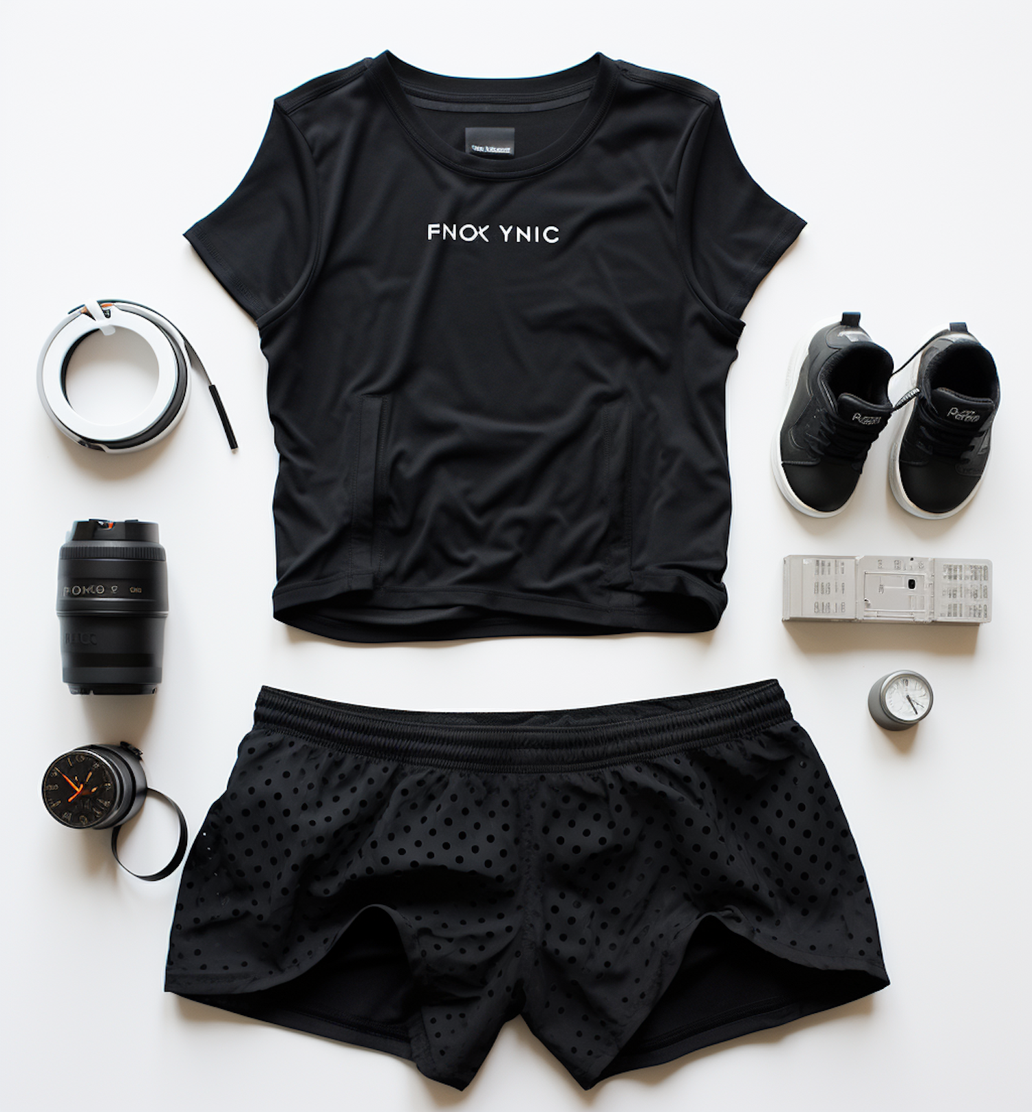 Flat lay of black athletic gear including a t-shirt, shorts, shoes, camera lens, and accessories on a white background.