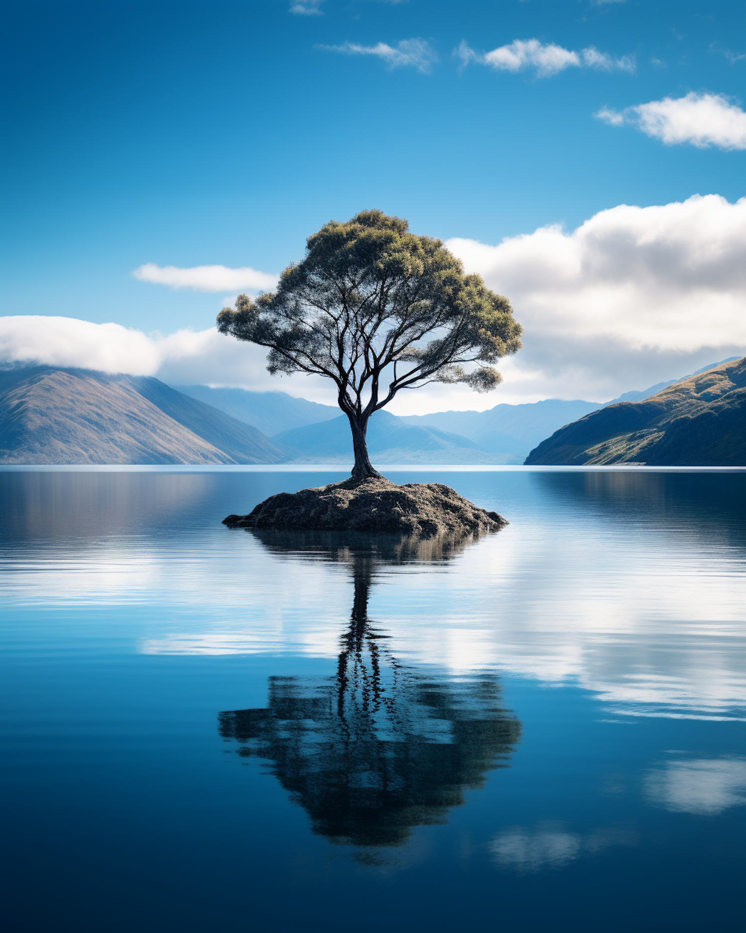A lone tree on a rocky island reflects in a tranquil lake, surrounded by mountains and a vibrant blue sky with scattered clouds.