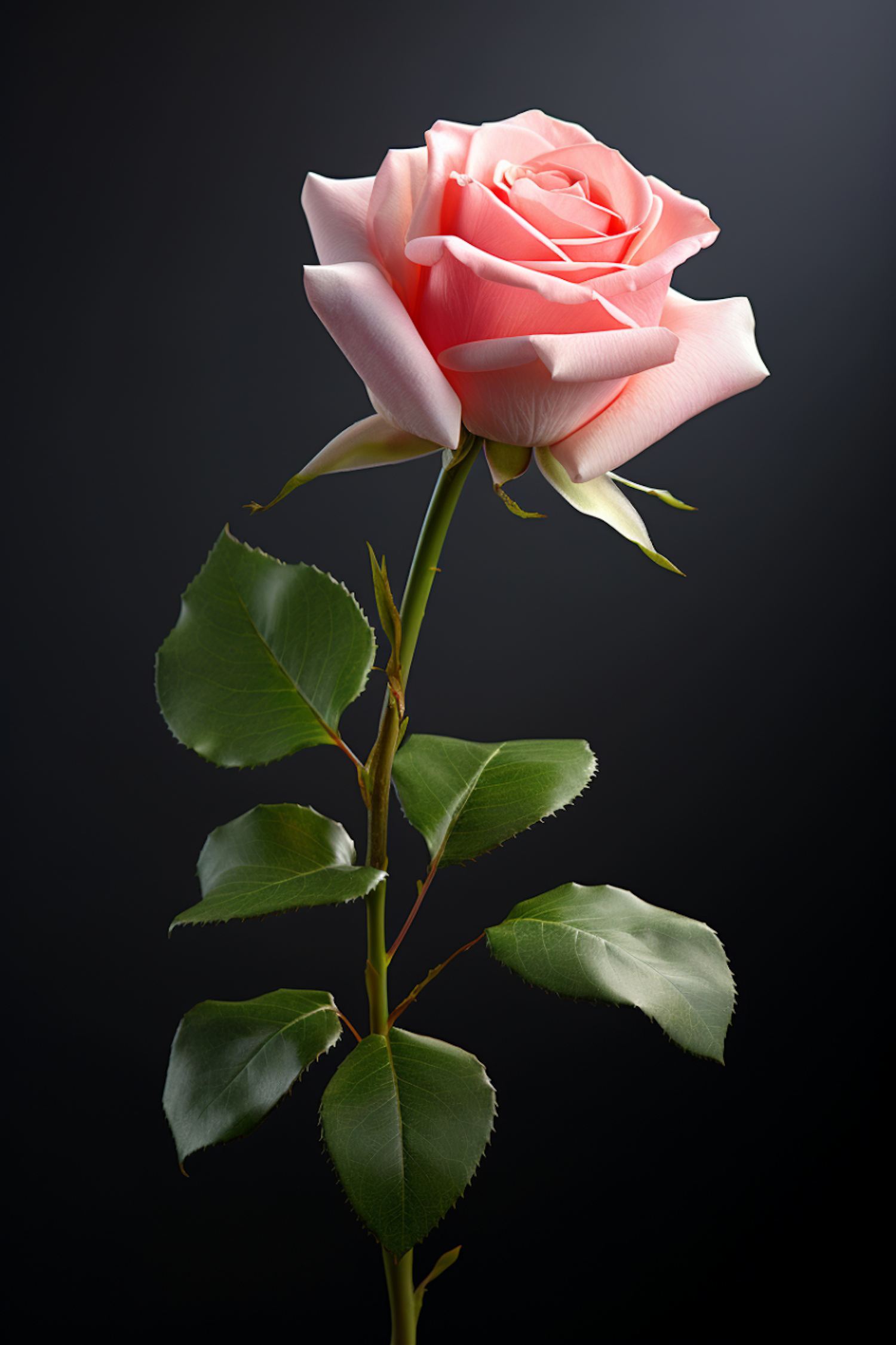 A stunning pink rose in full bloom against a dark background, highlighting its delicate petals and vibrant green leaves.