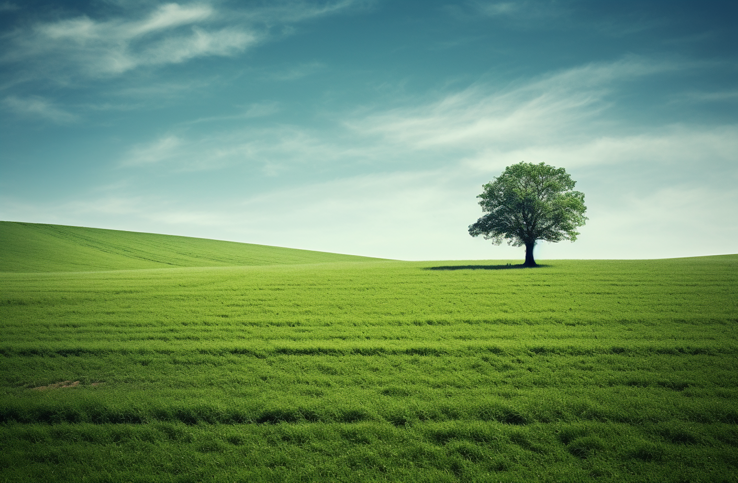 A lone tree in a vast green field under a clear blue sky, evoking serenity and tranquility.