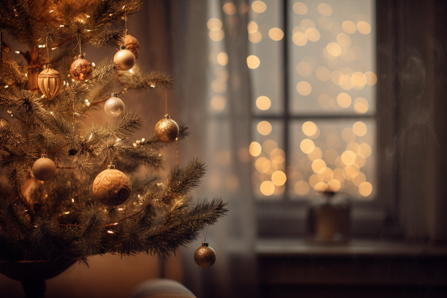 Cozy Christmas tree with golden baubles and warm lights, set against a softly lit window with twinkling bokeh in the background.